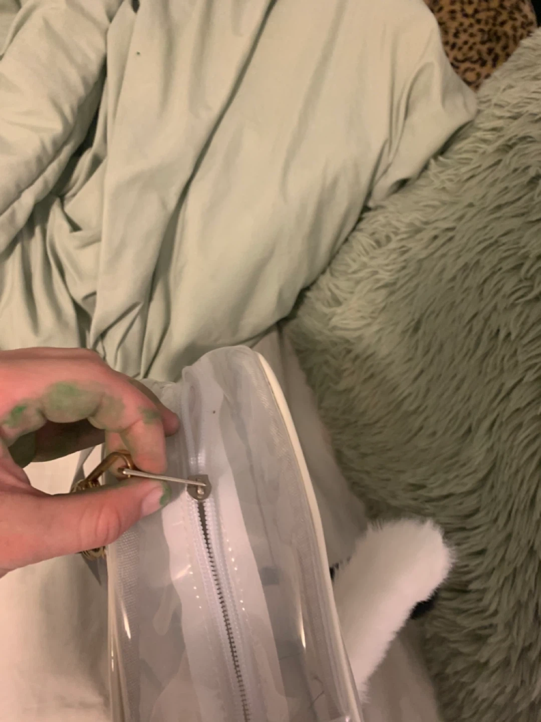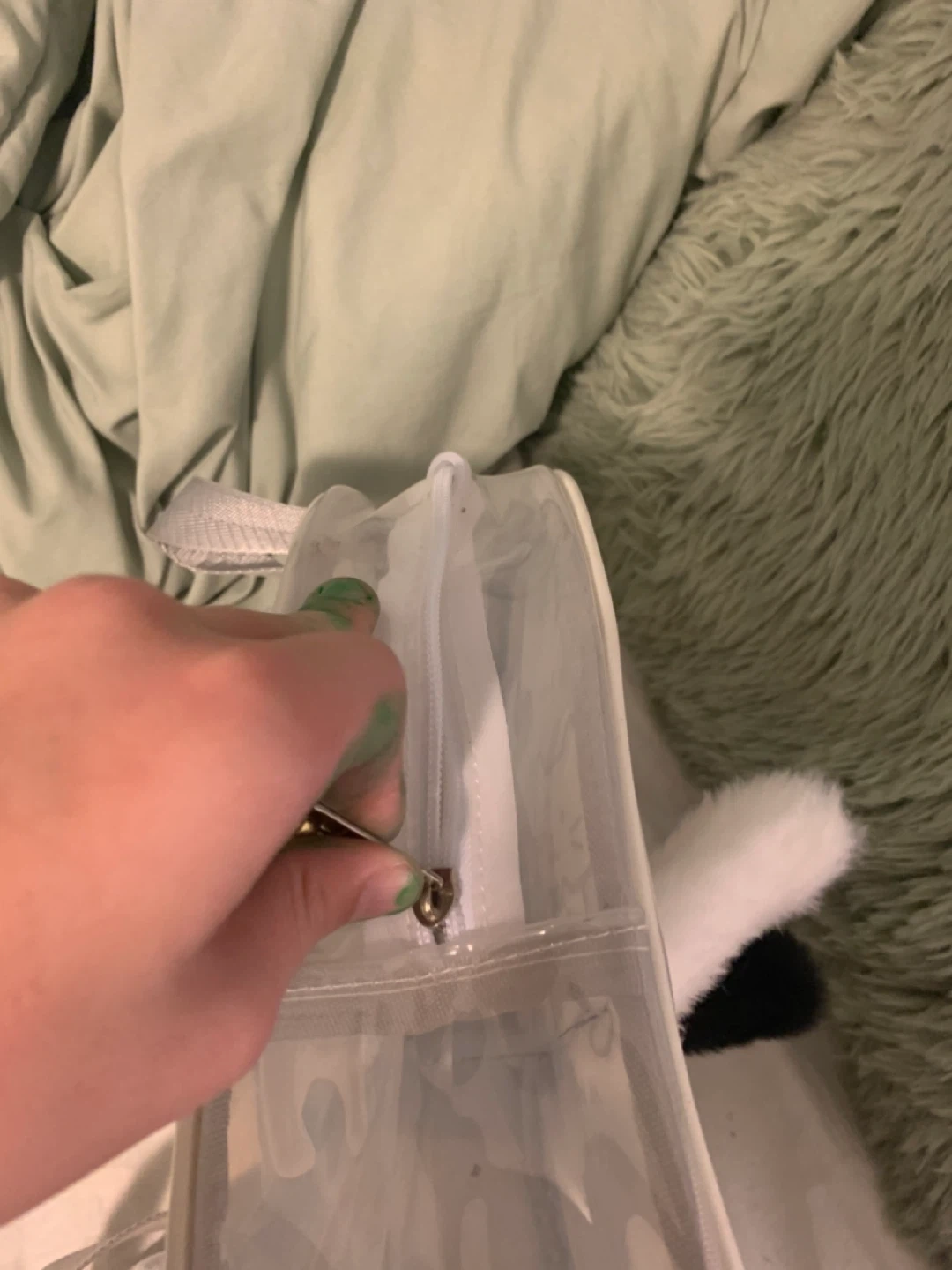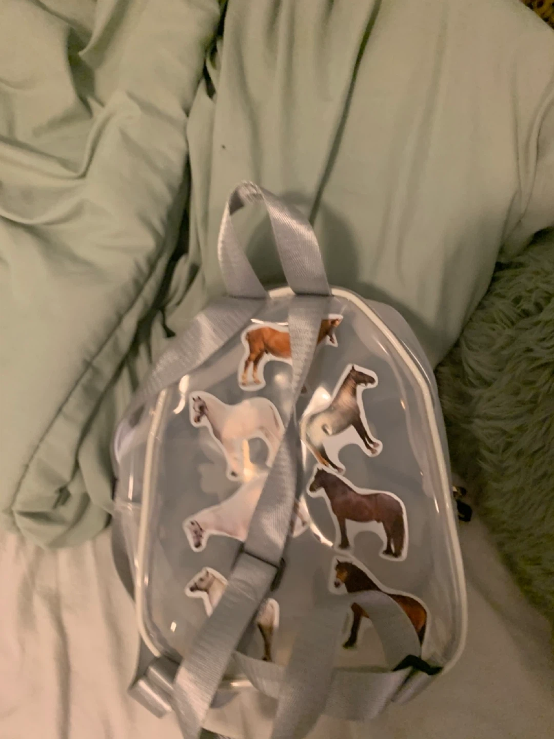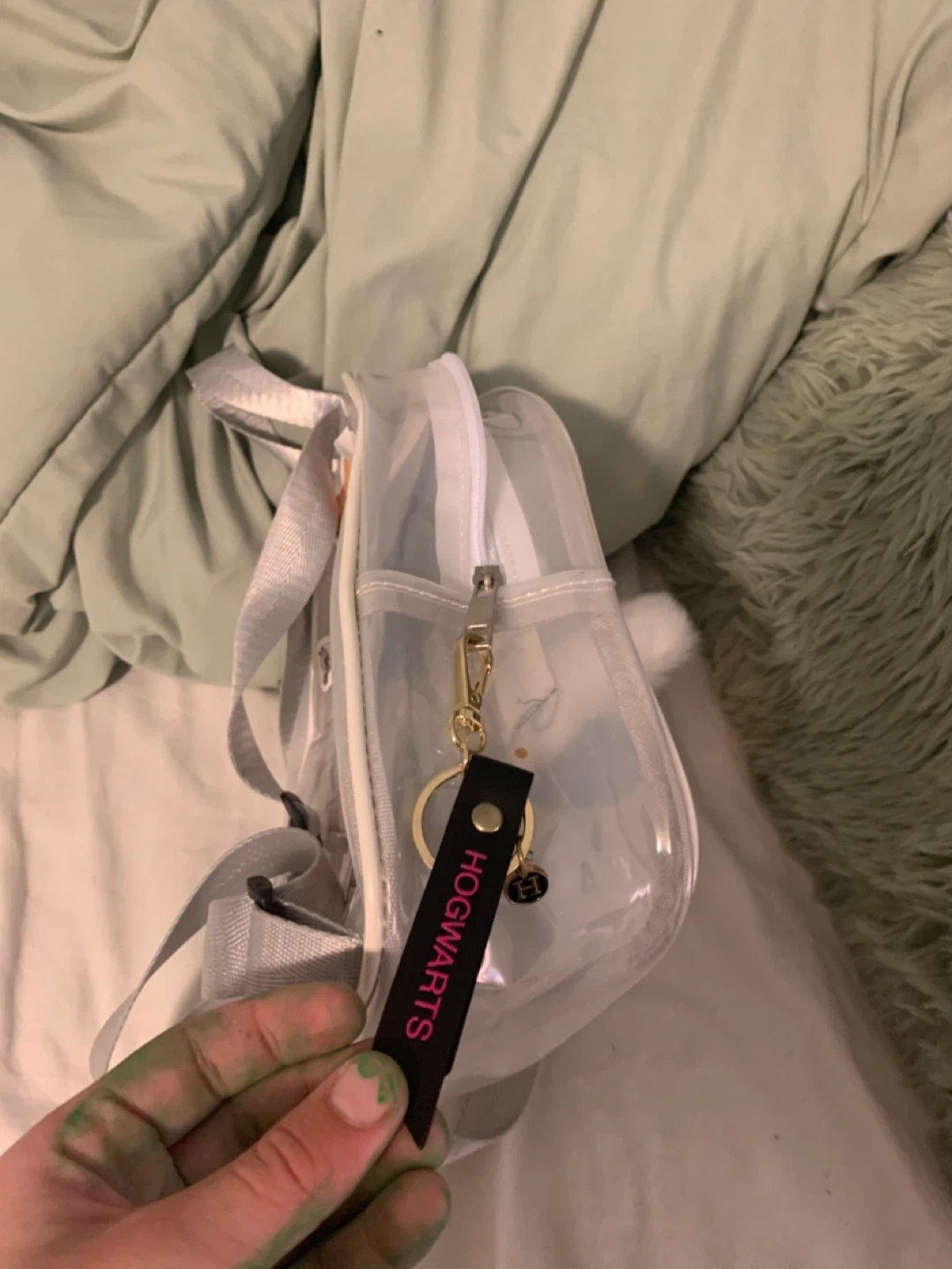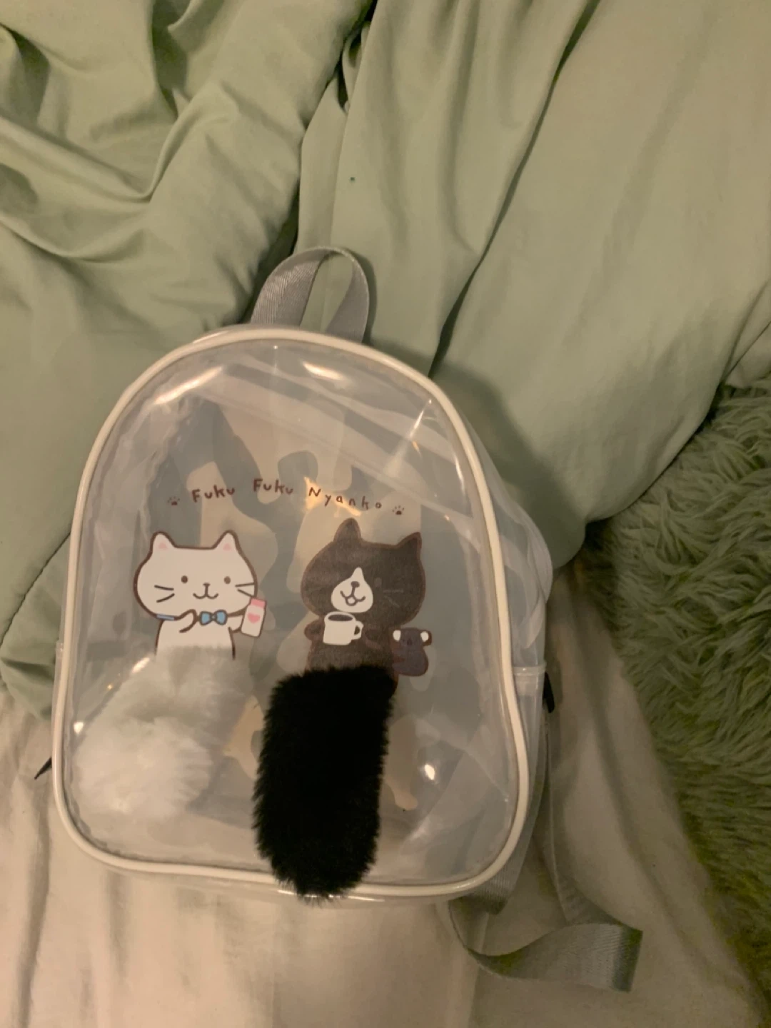 Selling a cute clear mini backpack! It features a cat design and is perfect for carrying small items. There is a Hogwarts keychain attached.