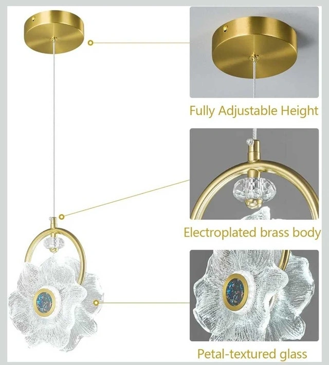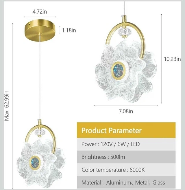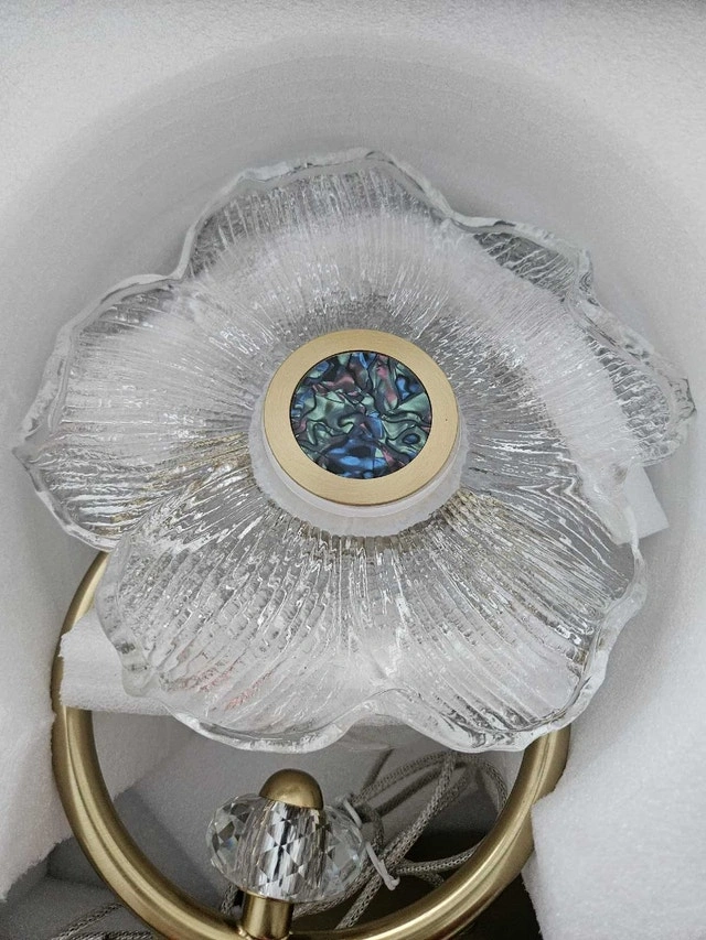 Brand new flower pendant light with a petal-textured glass shade and an electroplated brass body. This light has never been installed and features adjustable height. It's rated for 120V and uses a 6W LED, providing 500lm of brightness at 6000K. Materials include aluminum, metal, and glass. This would add a touch of modern glamor to any room! Specifications: Power: 120V / 6W / LED, Brightness: 500lm, Color temperature: 6000K, Material: Aluminum, Metal, Glass. Cash accepted.