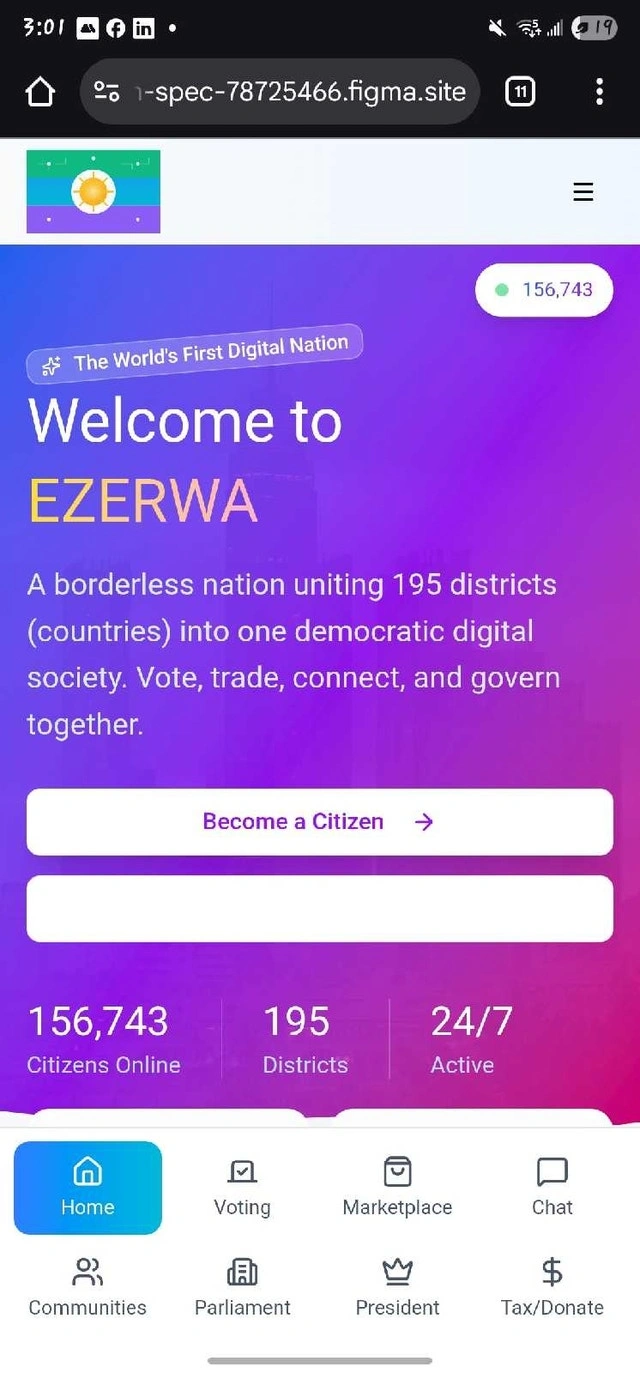 Explore the future with this online country app. As shown in the images, this is a borderless nation uniting 195 districts into one democratic digital society, where you can vote, trade, connect, and govern together. Looking for a buyer or partner to further develop and promote this innovative platform. If you are interested inbox me I will give you the link so you can admire it, offer me advice, become a citizen, pay your taxes or even buy a whole dang country haha. Come on lets have some fun