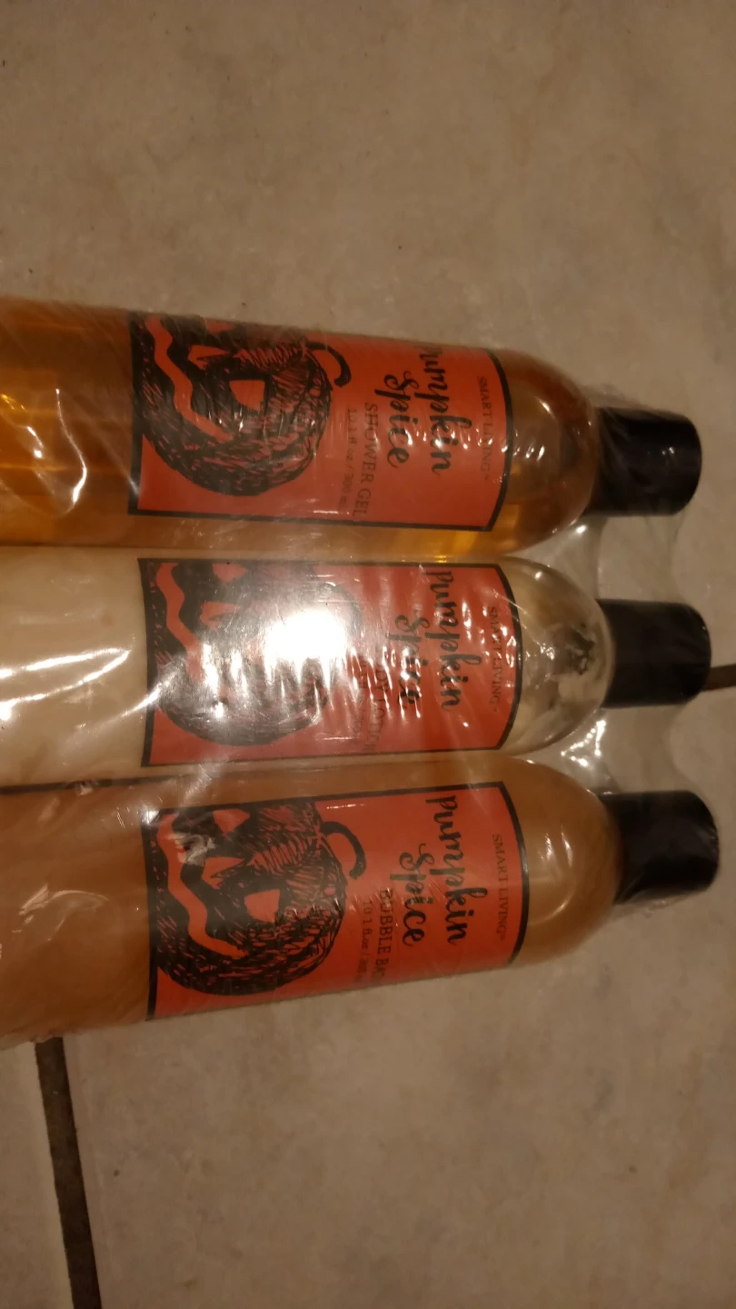 Selling three bottles of Smart Living Pumpkin Spice scented bath products! There's shower gel and bubble bath available, all in 10.1 fl oz (300 mL) bottles