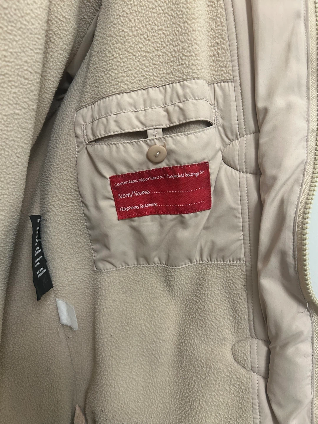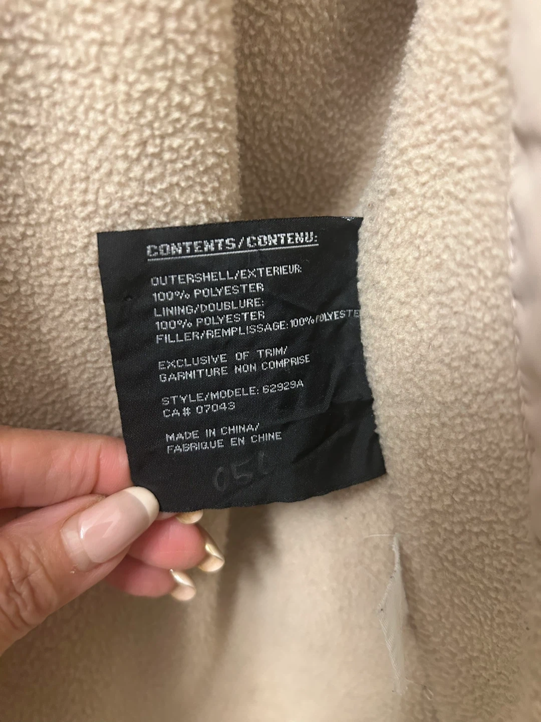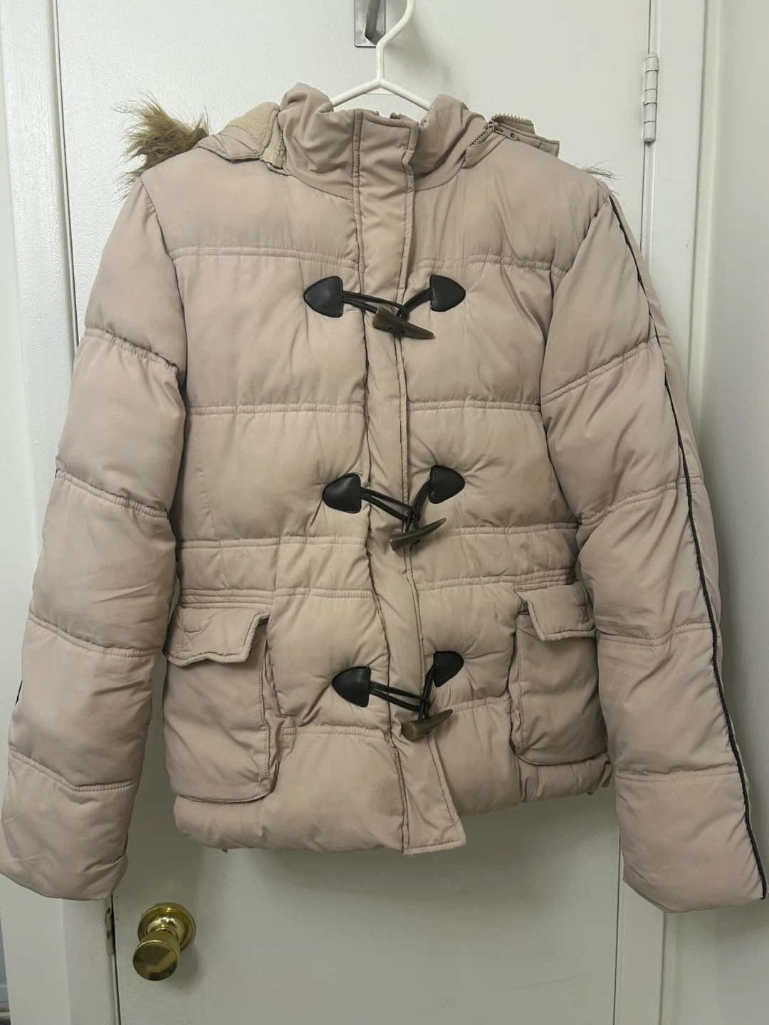 A cozy beige puffer jacket with a fur-trimmed hood! It has toggle closures and a stylish, warm design, perfect for chilly weather