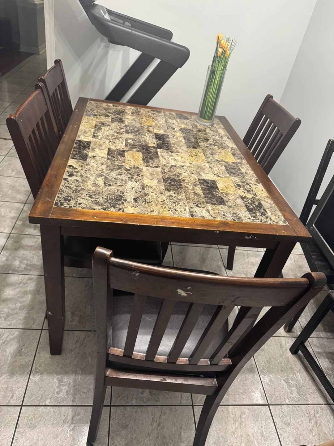 Selling a dining table with four chairs. The table has a patterned top and the chairs are a dark wood with padded seats. There are some signs of wear and tear, as shown in the photos.