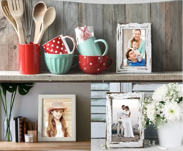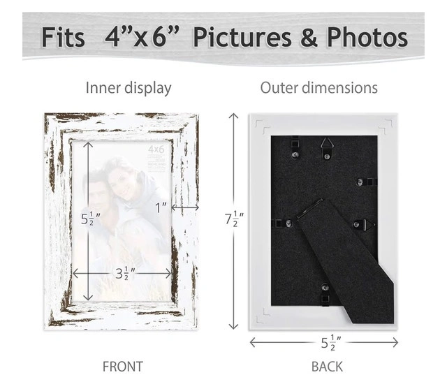 MODERN FARMHOUSE - Clean lines, neutral hues, textured wood accents, flat finish: Perfect for adding the finishing touch to any living room, family room, hallway, bedroom, den, or office. PREMIUM-QUALITY - MDF is a solid, high-grade material that is both durable and sustainable; High-definition glass provides clarity and image protection. VERSATILE - Hang these gorgeous frames either vertically or horizontally with the attached hooks or display them in portrait or landscape orientation with the easel kickstand. INCLUDES - 3 Distressed White frames with D-ring hooks, non-trace nails, and kickstand easel to display in either portrait or landscape orientation; Fits standard 4 x 6 inch (10x15 cm) photographs, art prints, or special memento
