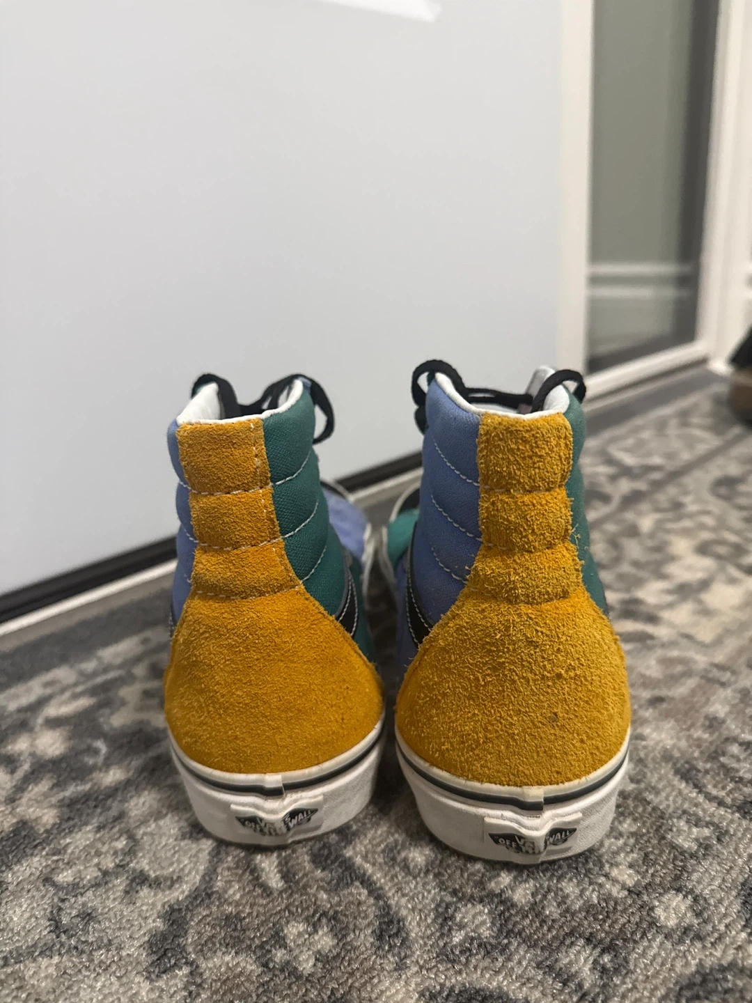 These Vans Sk8-Hi sneakers are in a cool colour block design with shades of green, blue, yellow, and black! They're in great condition and ready for a new home. Perfect for adding a pop of colour to your outfit! 8.5 Men’s, 10 Women’s.