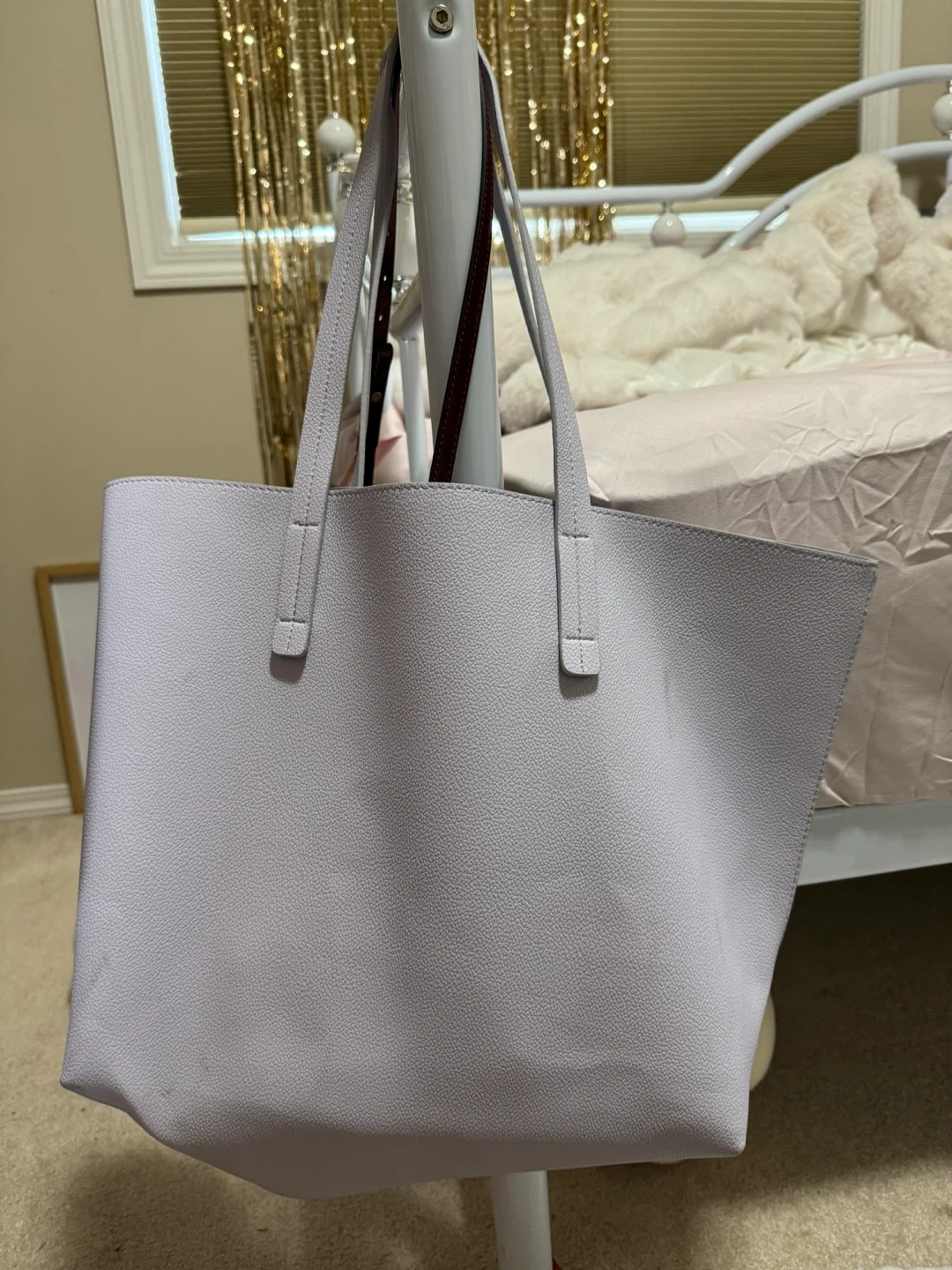 Selling a light purple tote bag. It's in good condition and perfect for carrying your everyday essentials. The bag features a simple and stylish design with comfortable straps. It's a great accessory for any outfit!