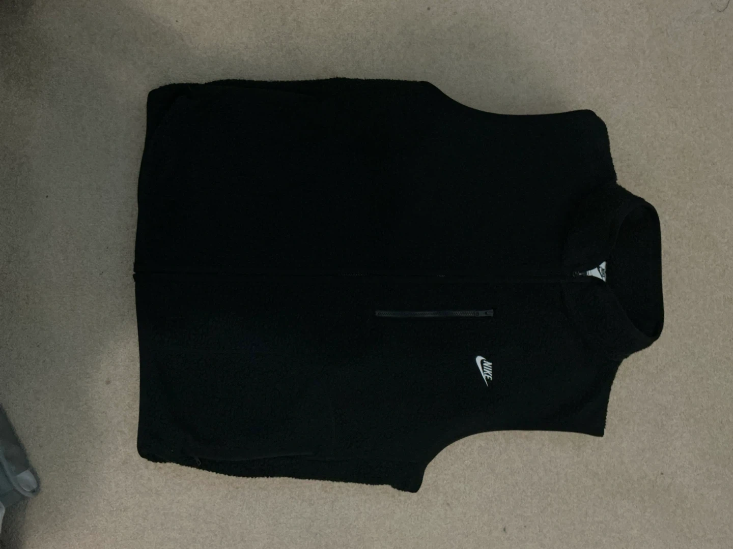 Selling a Nike black fleece vest! It's in great condition and perfect for layering. The vest features a zipper pocket and the classic Nike logo