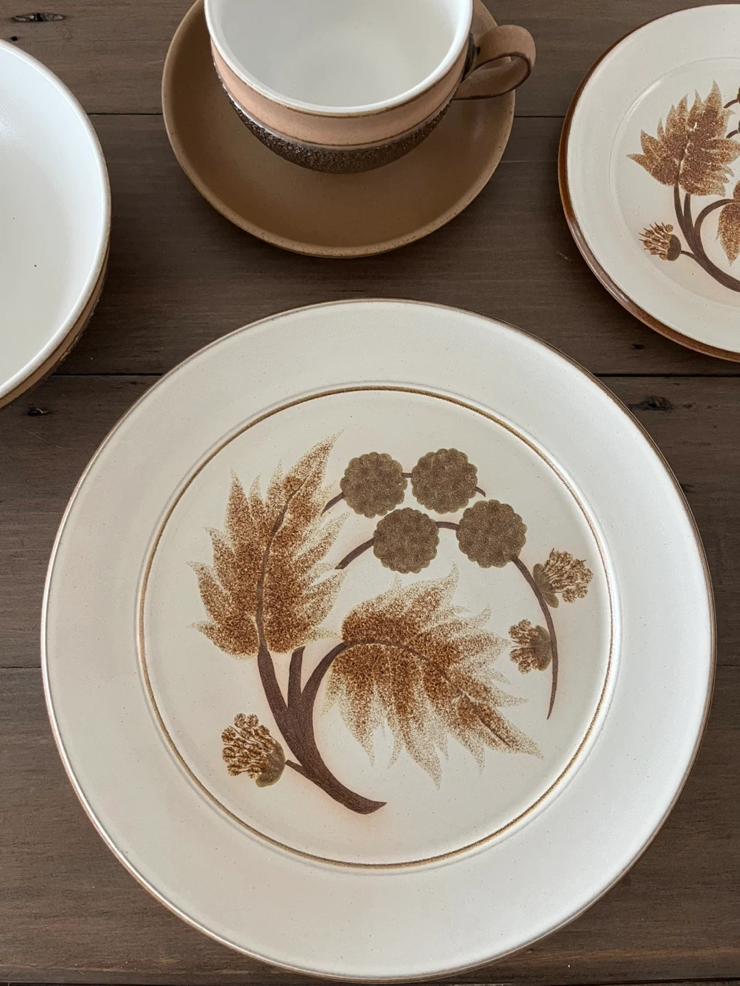 Selling a Denby Pottery dinnerware set, made in England! The set features a lovely floral design in neutral tones. There are multiple plates, bowls, cups, and saucers included. Perfect for adding a touch of vintage charm to your dining table!