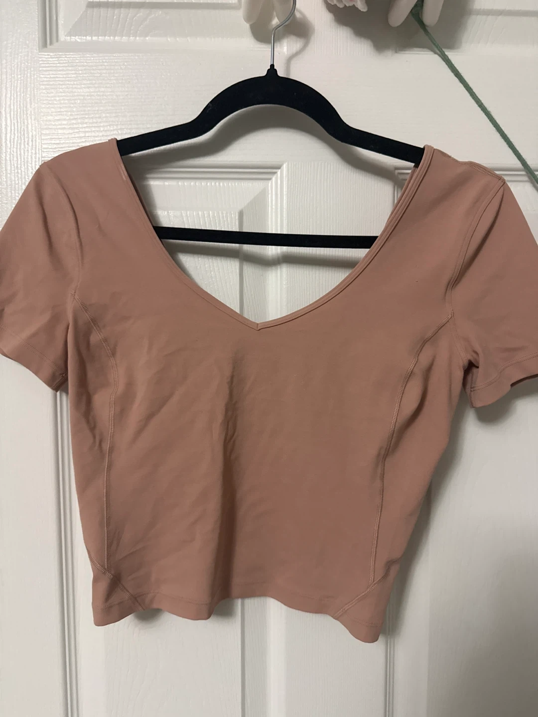Selling a Lululemon Align Cropped T-Shirt in a size 6. It's in great condition and ready for a new home. The colour is a beautiful neutral tone, perfect for any workout or casual outfit