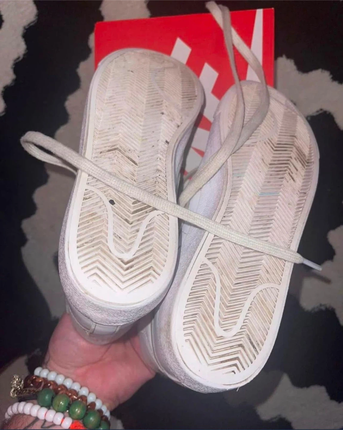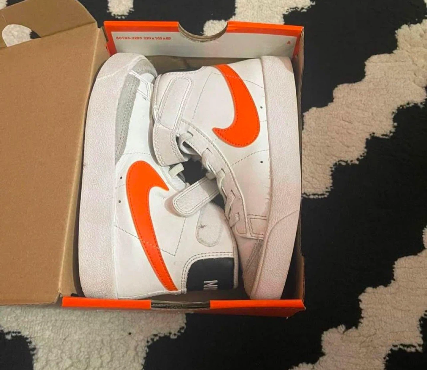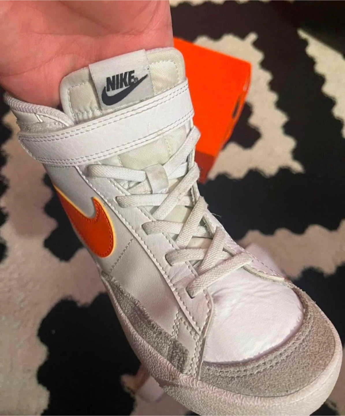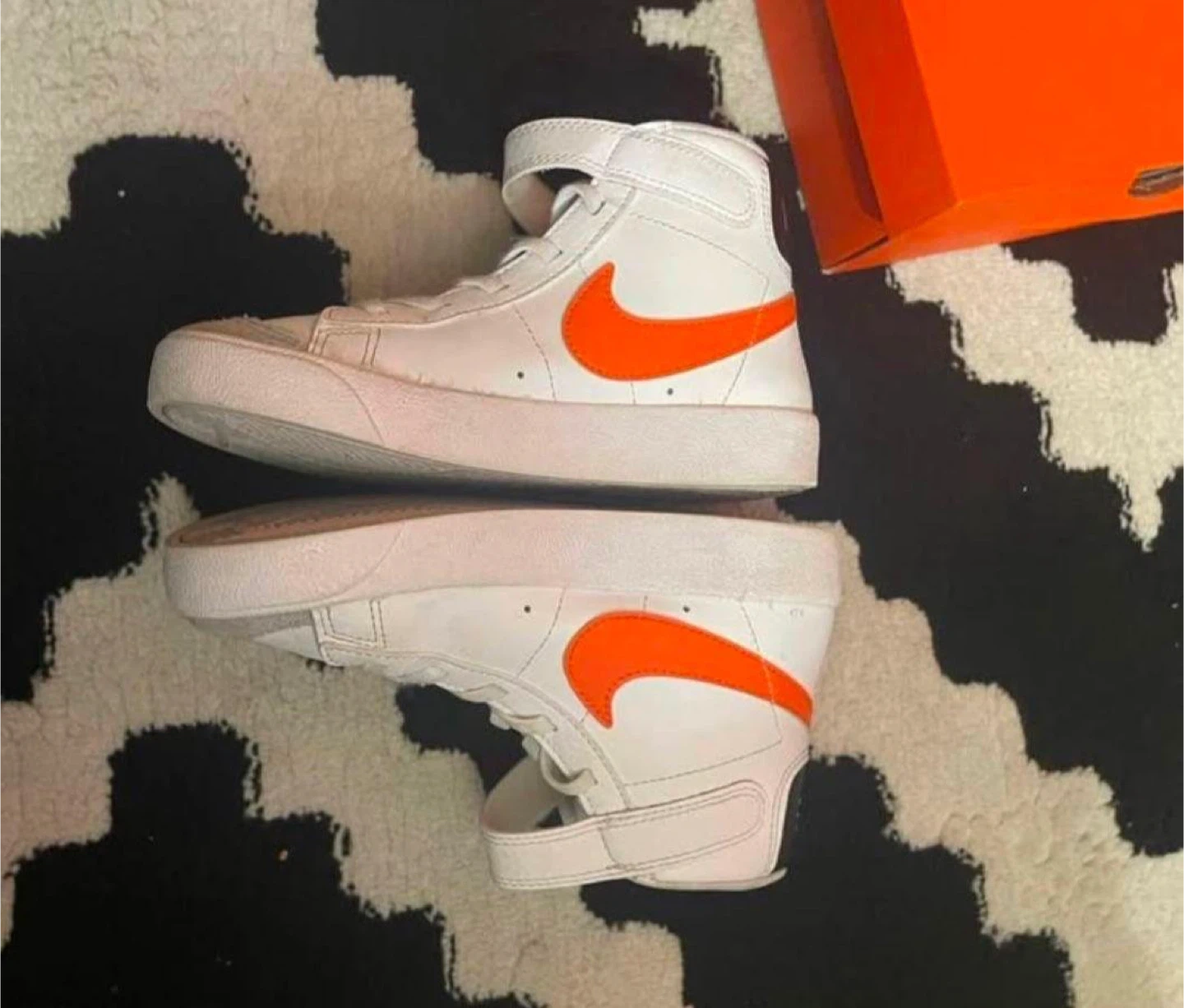 Selling a pair of Nike Blazersize 1Y Mid '77 high-top sneakers! They feature a white and orange color scheme. The shoes show some signs of wear, as seen in the photos, but they still have plenty of life left. Comes with the original box