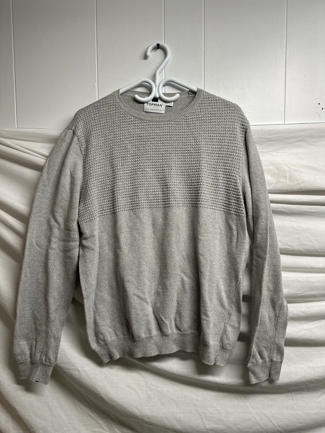 Here's a comfy Topman knit sweater in a lovely grey colour! It's a size L, perfect for layering or wearing on its own. It's in great condition and ready for a new home!