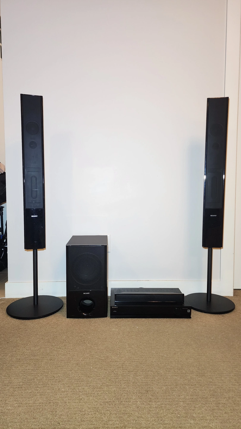Complete 5.1-channel Sony surround sound system often sold as the HT-SF470 kit. Includes AV receiver (STR-KS470), two front speakers (SS-MSP37F), one center speaker (SS-CNP37), two surround speakers (SS-SRP37F), and powered subwoofer (SS-WP37). Supports Dolby Digital, DTS Digital Surround, and Pro Logic formats for immersive home cinema sound. HDMI connectivity with Audio Return Channel (ARC) and Signal Pass Through enables easy linking to Blu-ray players, consoles, and TVs. Receiver size ≈ 43 × 14.5 × 30 cm (17 × 5.7 × 11.8 in). Includes all speaker cords and mounting options; ideal mid-range setup for most living rooms. No Remote Control. Pick-up at 3565 Wesbrook Mall - UBC.