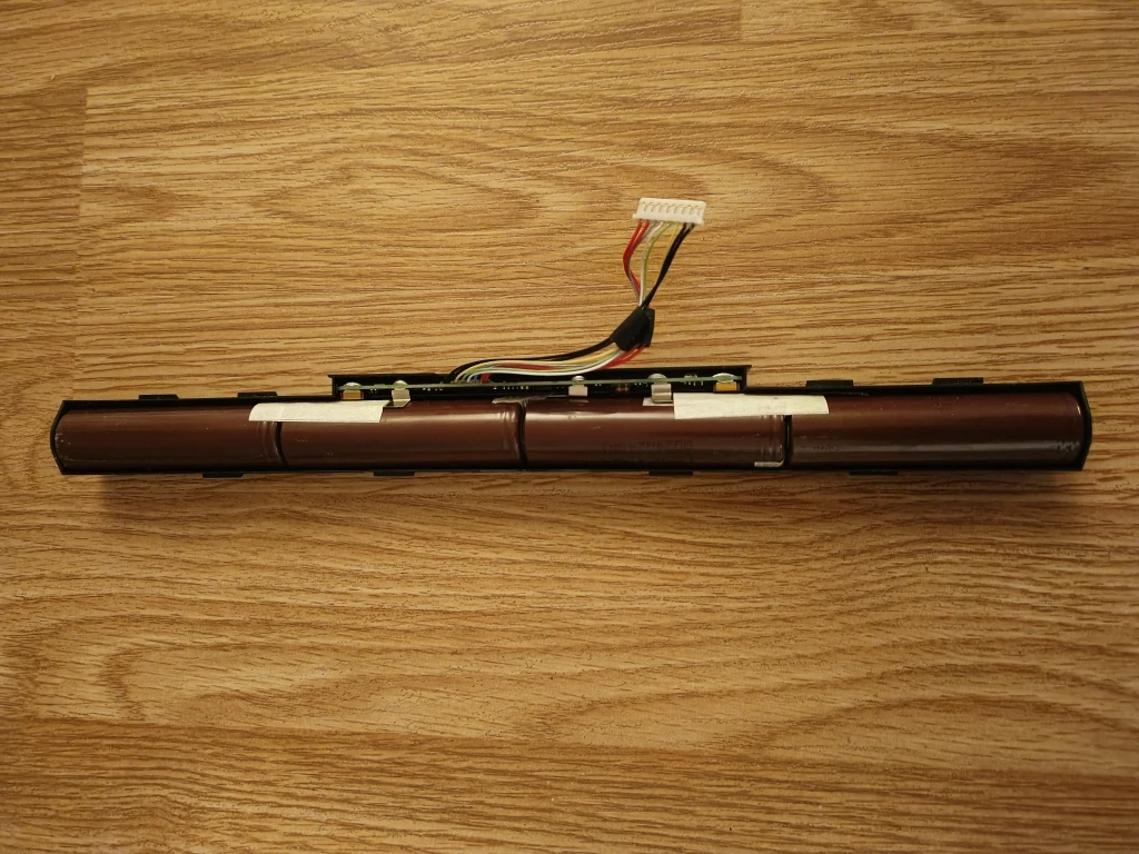 Battery in the last picture is dead and removed. You may replace the four 18650 battery cells to revive the battery.