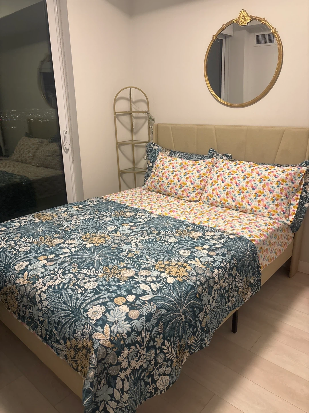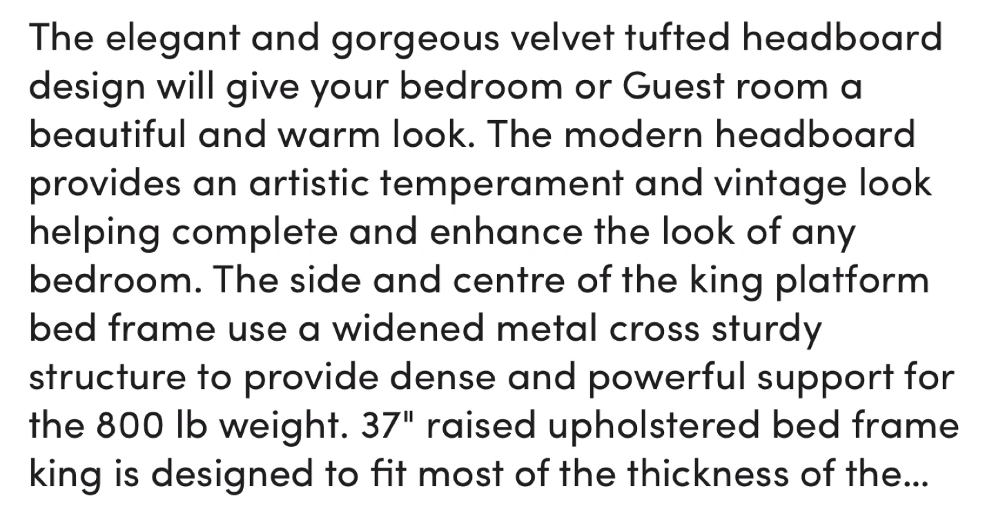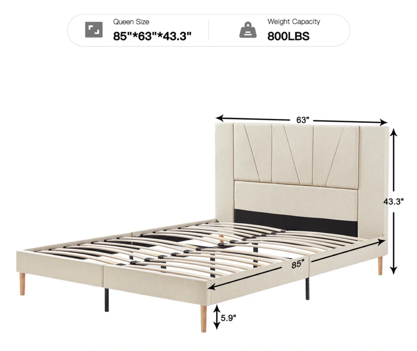 Elegant queen size platform bed frame with a beige linen headboard. The headboard has a classic simple line design, bringing a warm appearance to your bedroom. It's designed with high-quality foam padding for comfort and relaxation. The bed frame has a sturdy metal cross structure that supports up to 800 lbs. It has 6-inch space under the bed for storage and is easy to assemble with the included instructions.
