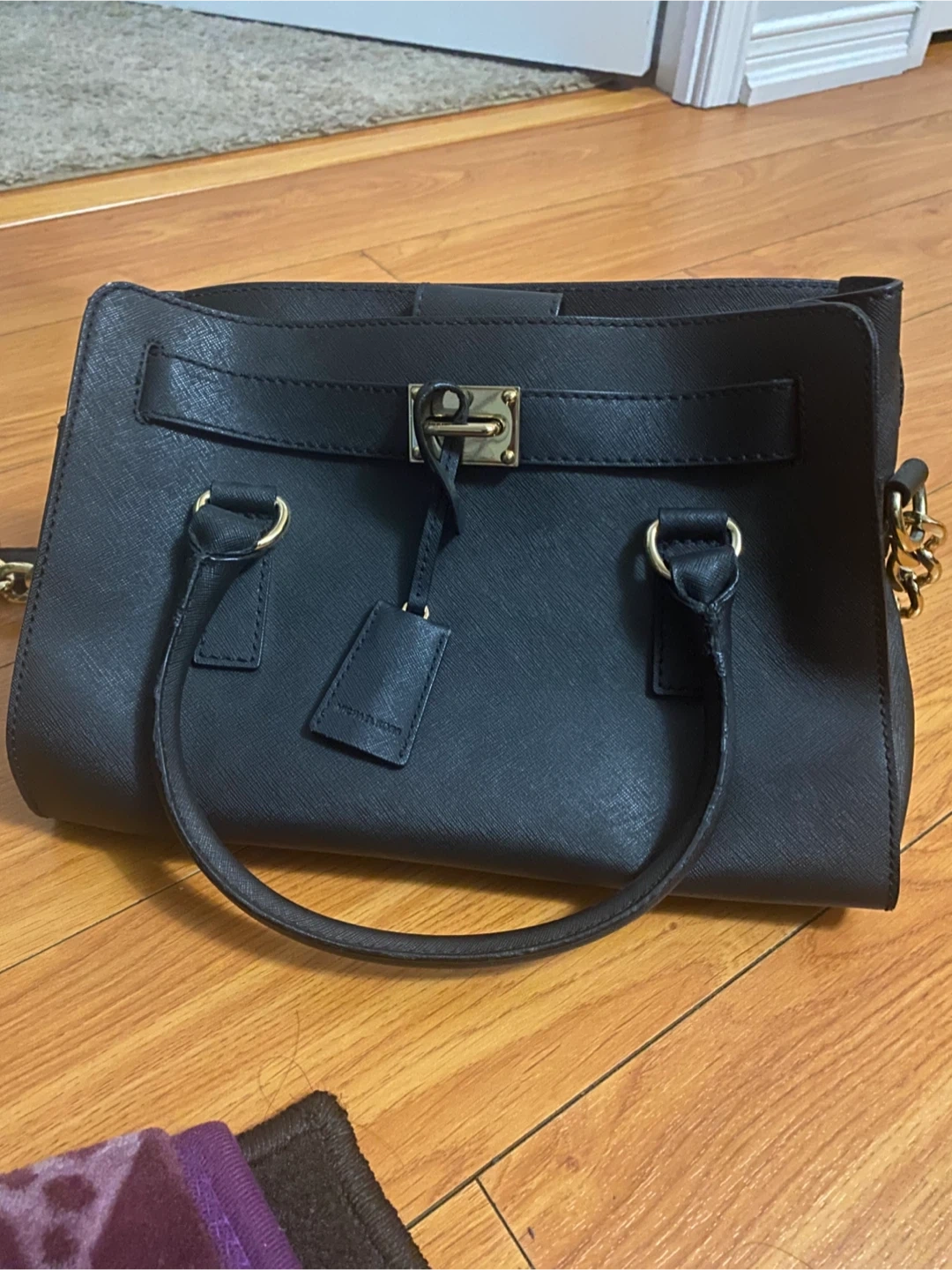 Selling a Michael Kors satchel in black. It has a gold chain detail and some minor wear and tear as shown in the photos.