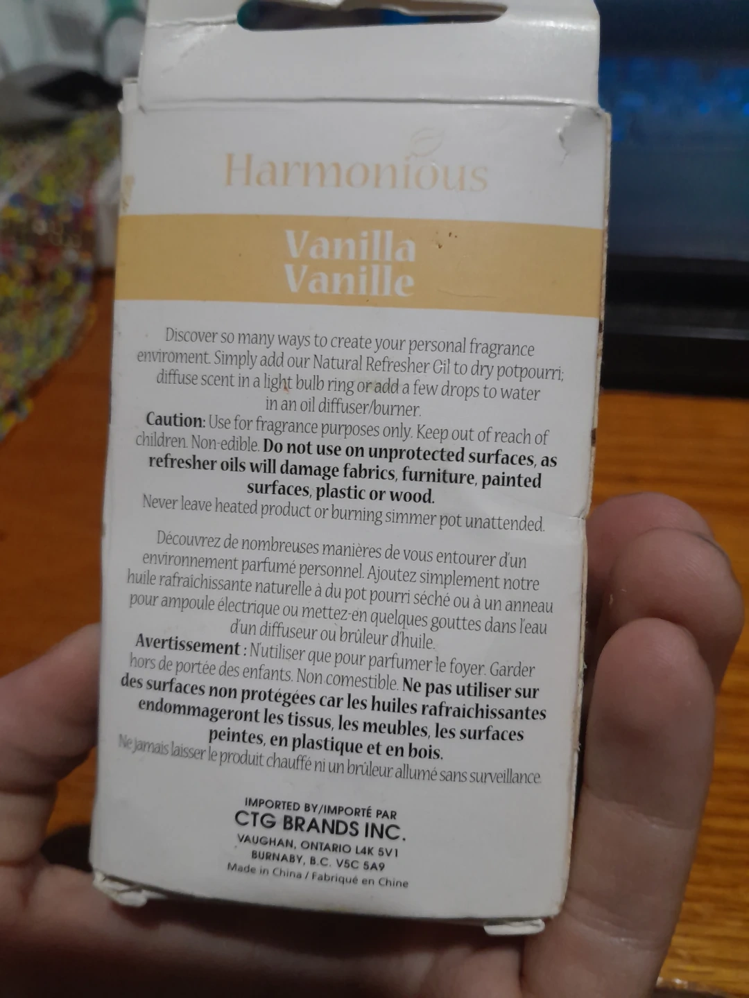 189I'm selling a brand new bottle of Harmonious Vanilla Natural Refresher Oil! This 10ml bottle is perfect for creating a personal fragrance environment. Simply add it to a light bulb ring or a diffuser to enjoy the vanilla scent in your home
