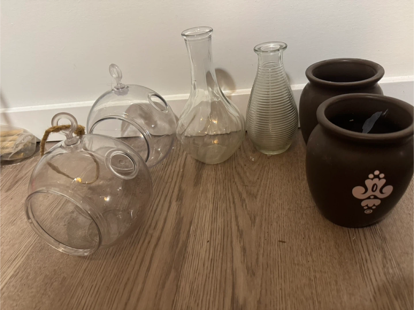 Selling a collection of vases and planters! There are a few different styles, including clear glass hanging terrariums and brown ceramic planters. Perfect for adding some greenery to your home!