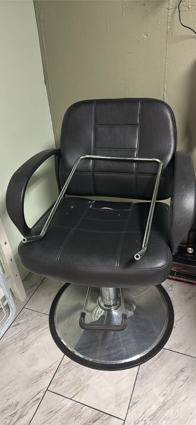 Selling a black salon or barber chair. It has a hydraulic lift and a chrome base. The chair shows signs of wear on the seat. Great for a salon or barber shop!