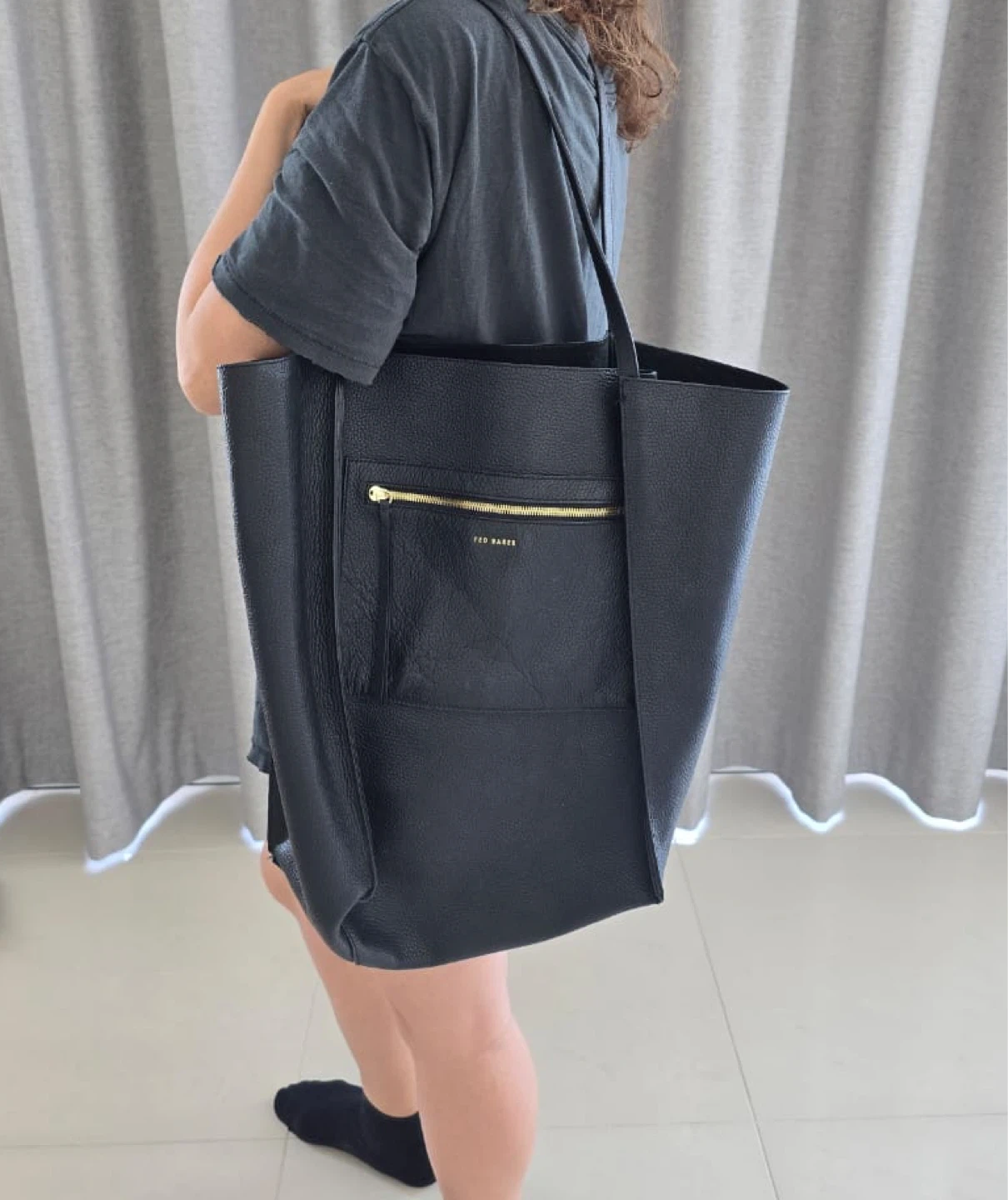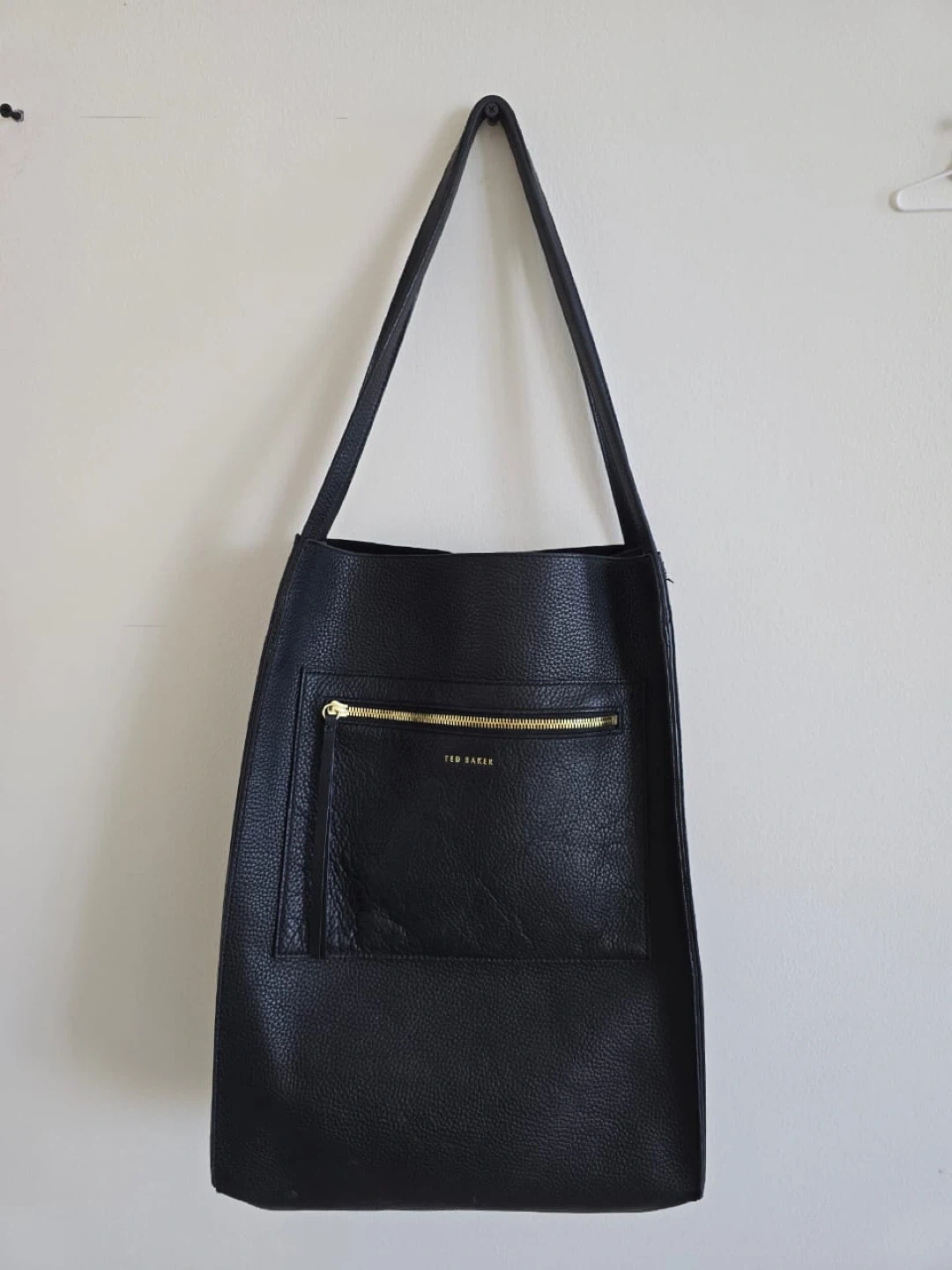 Selling a Ted Baker black leather tote bag. It's in great condition and has a stylish design with a front pocket and gold zipper detail. Perfect for everyday use!$50