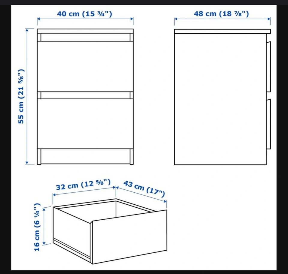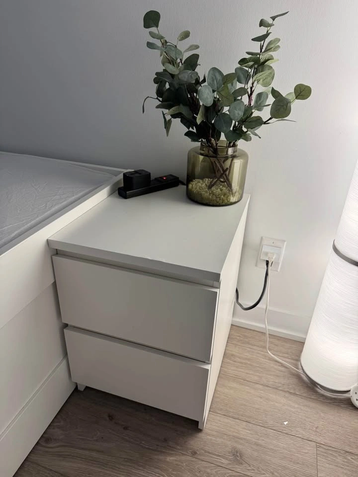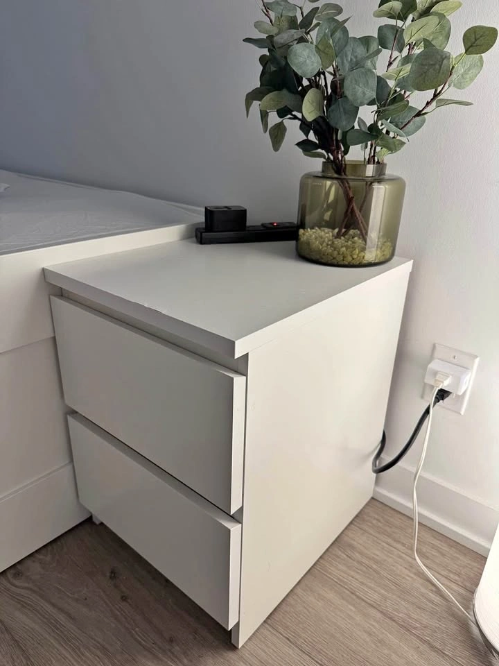 Classic IKEA MALM 2-drawer chest in white — sleek, minimalist design that fits perfectly beside a bed or in a small space. Both drawers open smoothly and offer plenty of storage for clothes, accessories, or bedside essentials.