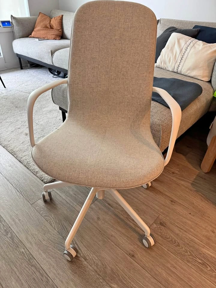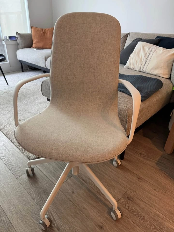 IKEA Langfjall office chair with armrests. Adjustable height, smooth swivel, and padded seat. Great for home office.