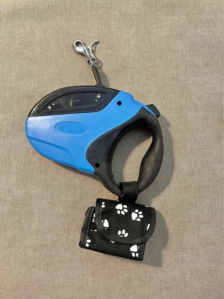 Gently used retractable dog leash with attached waste bag holder (black with white paw print design).