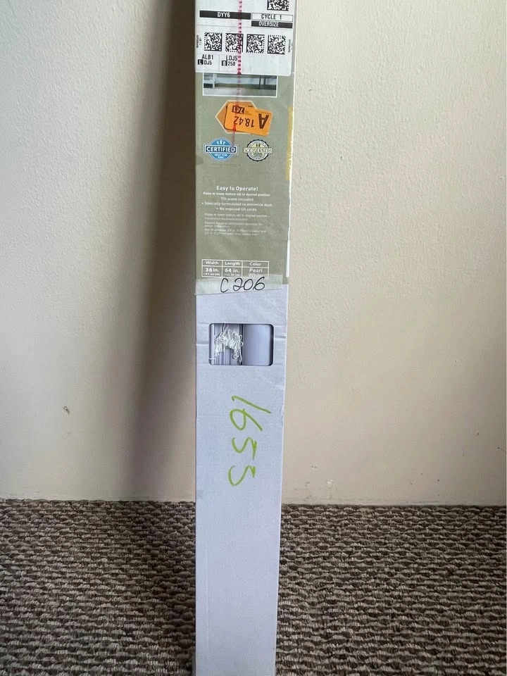 Cordless light filtering mini blind -- pearl white. Ordered two by mistake from Amazon and missed return deadline-- unopened box. Iβm using the other one and it works great.