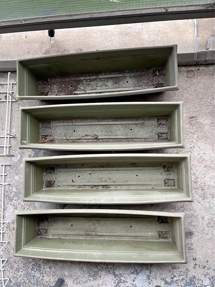 Four durable 30-inch flower boxes in soft sage green — perfect for flowers, herbs, or balcony gardens. Weather-resistant and lightweight, easy to move and clean.