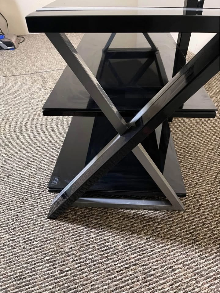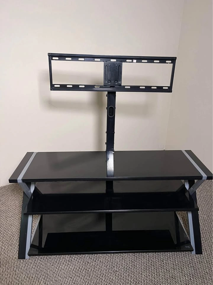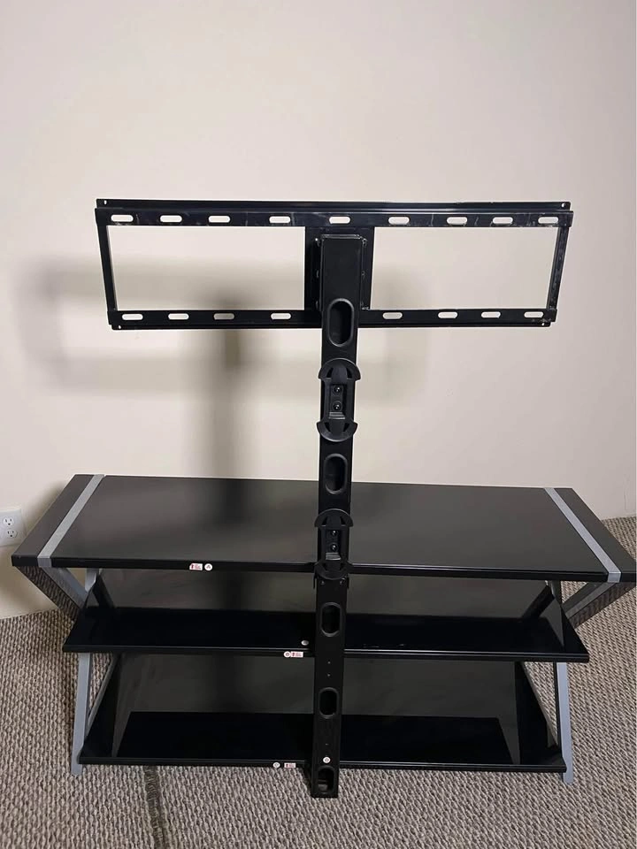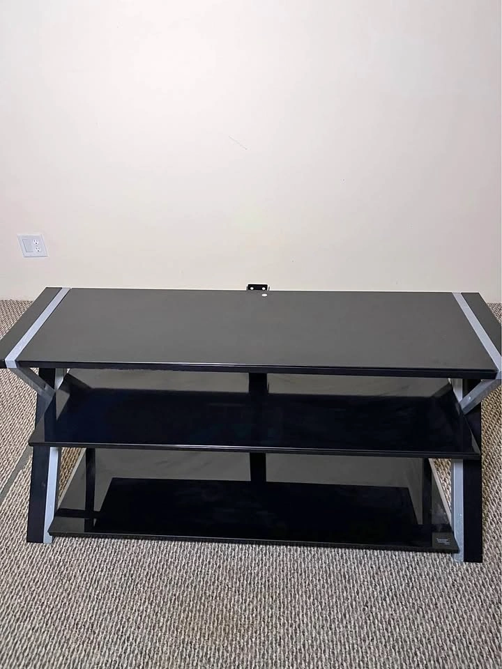Modern, sturdy black entertainment center with sleek black shelves — perfect for TVs, consoles, or media gear.