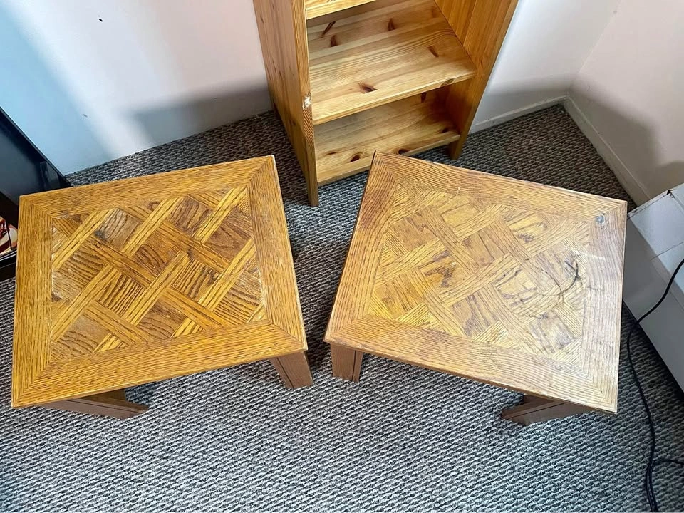 Set of two solid wood side tables with a classic parquet-style top.