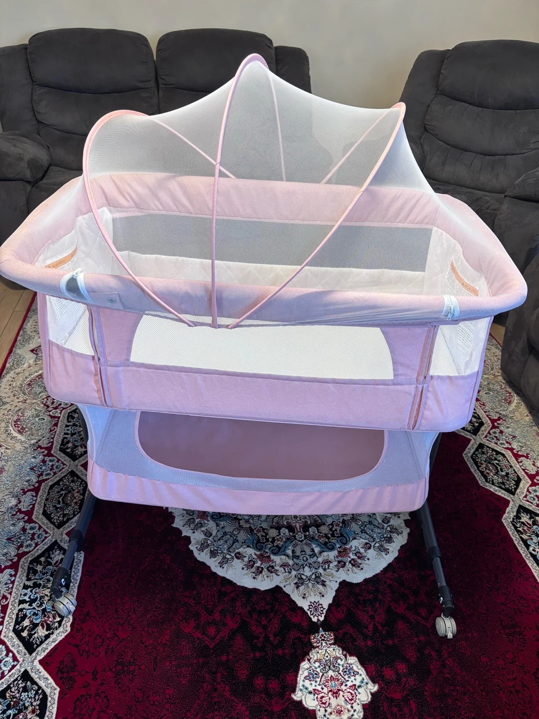 Selling a gently used pink baby bassinet! It comes with a mosquito net to keep your little one safe and sound. Perfect for newborns and infants, this bassinet is a cozy and convenient sleeping solution for your baby.