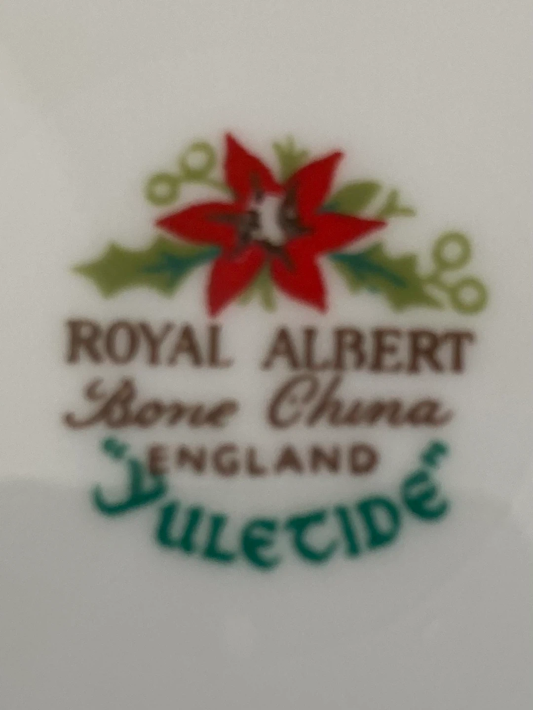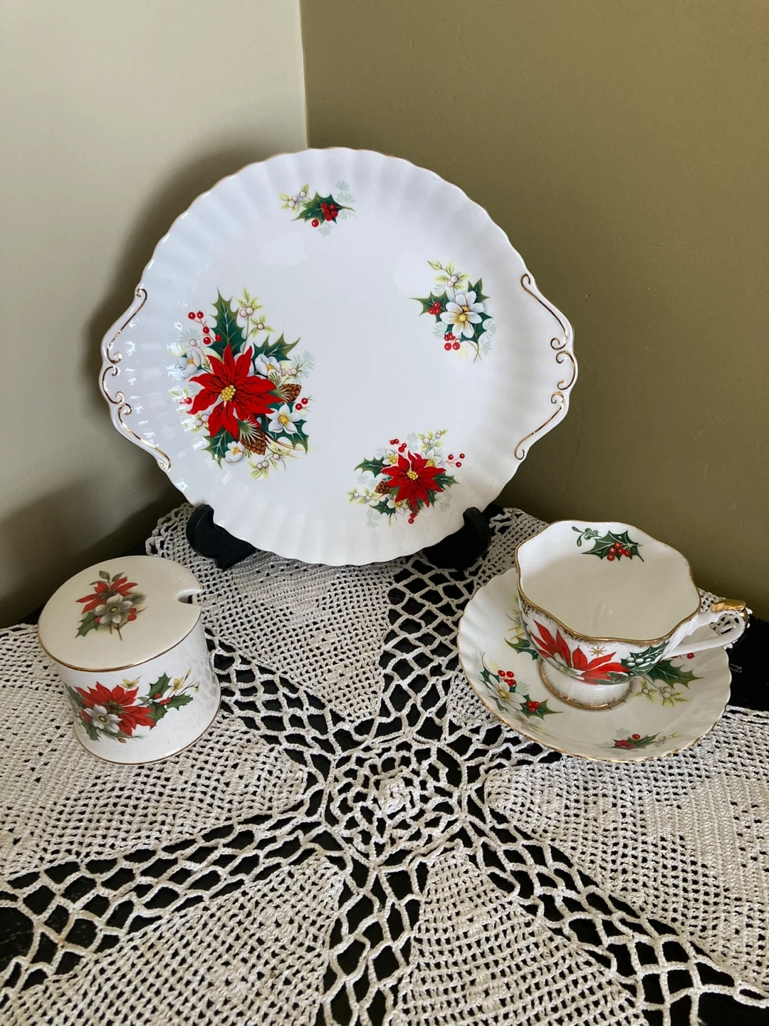 Selling a beautiful Royal Albert Juletide bone china tea set! It includes a cake plate, a covered sugar bowl, a teacup, and a saucer. The set features a lovely poinsettia and holly design, perfect for the holidays