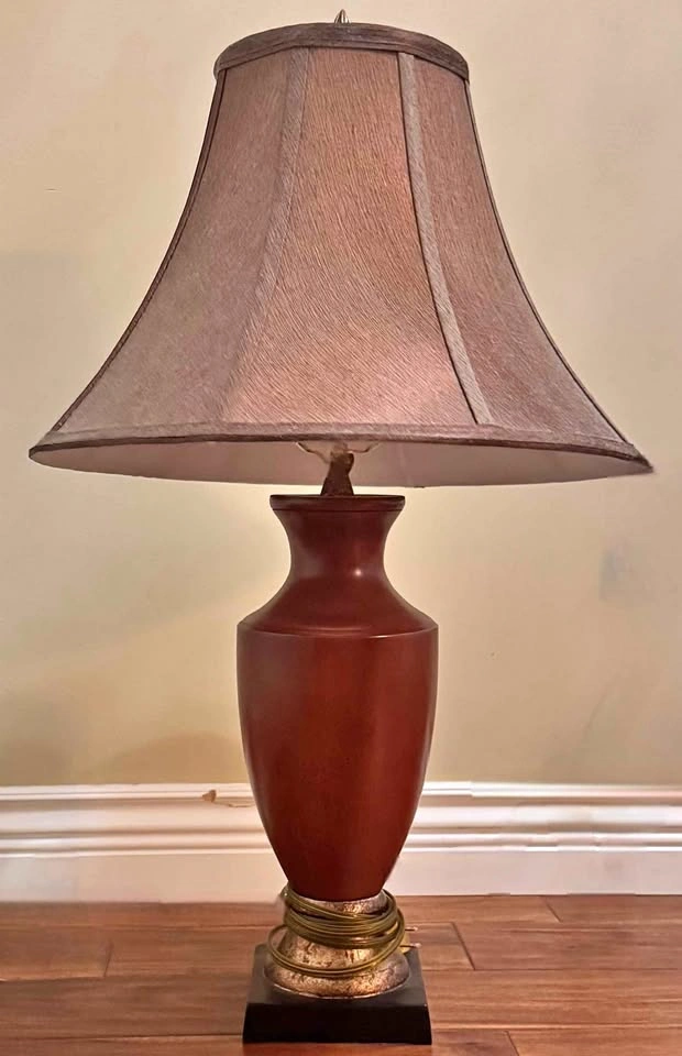 Beautiful table lamp with a brown shade and shades of brown and bronze for the base. The lamp has a simple, classic design and is in great condition.