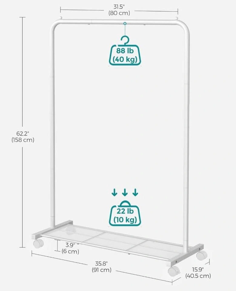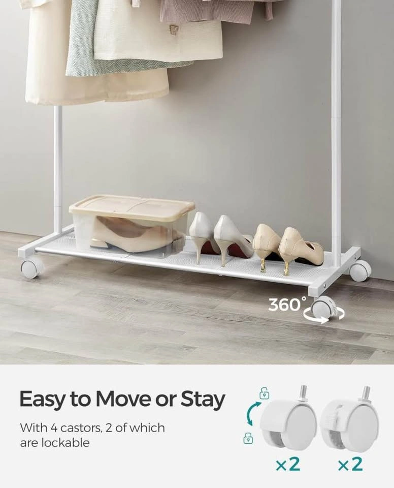 116Pick up at Brock Road and Rex Heath Drive in Pickering. A sturdy, stylish, and easy-to-move clothing rack perfect for bedrooms, laundry rooms, hallways, or small spaces! Smooth-rolling wheels (with 2 brakes) make it effortless to reposition, while the dense mesh shelf gives you extra storage for shoes, baskets, or bags. Features you’ll love: ✔️ Strong steel frame – holds up to 110 lb ✔️ 35.8” wide hanging space ✔️ Smooth wheels + 2 brakes for stability ✔️ Dense mesh bottom shelf for added storage ✔️ Clean white finish that suits any room Perfect for organizing daily outfits or adding extra wardrobe space! Brand New • Smoke-Free Home