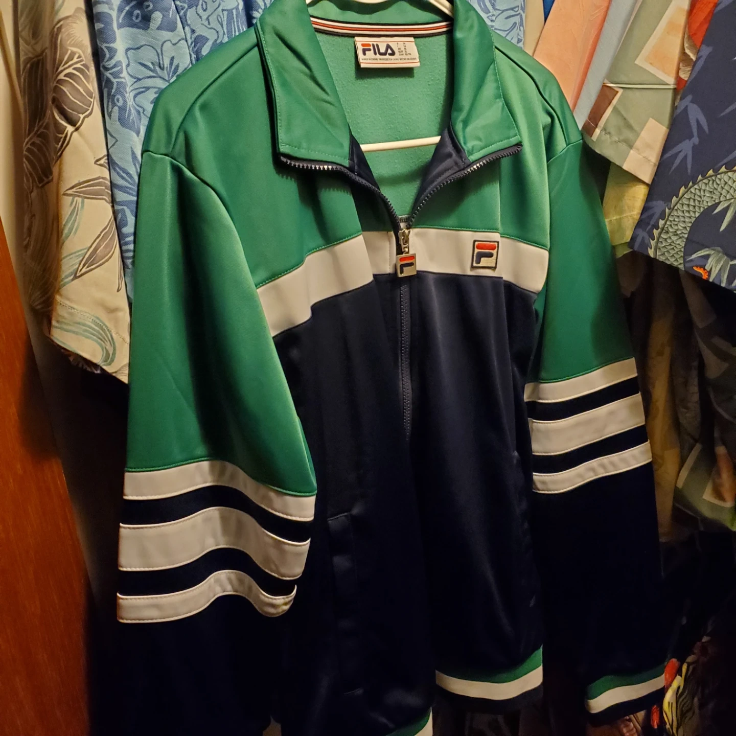 Selling a Fila track jacket in size XL! It's a cool mix of green and navy. Perfect for workouts or just hanging out