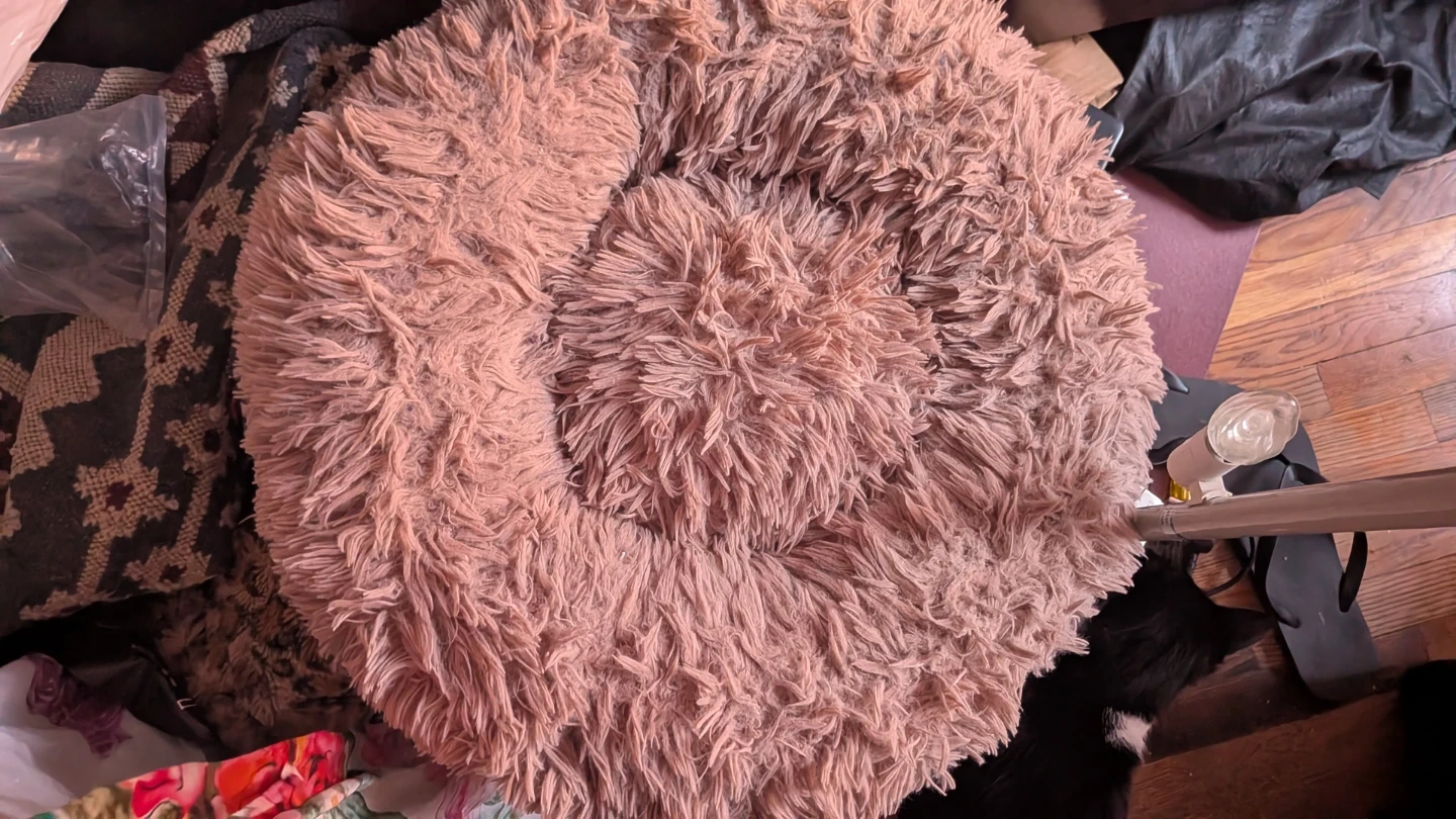 Selling a super cozy, fluffy pet bed! It's a lovely tan color and looks like it would be perfect for a small dog or cat to curl up in. It's in great condition and ready for a new furry friend. A karroter gave this to me. My cat used it once and jumped into my new bed. It was washed and could use a good home!