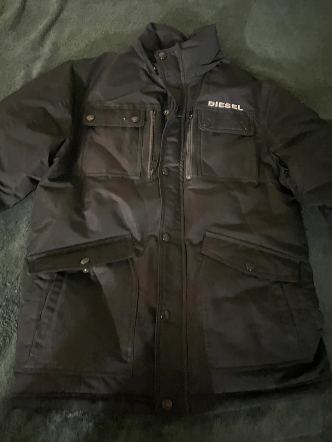 I'm selling a Diesel black padded jacket. It's in great condition and ready for a new home! This jacket is perfect for staying warm and stylish during the colder months. The material is durable and comfortable, making it ideal for everyday wear. It features a classic design with functional pockets and a sleek silhouette