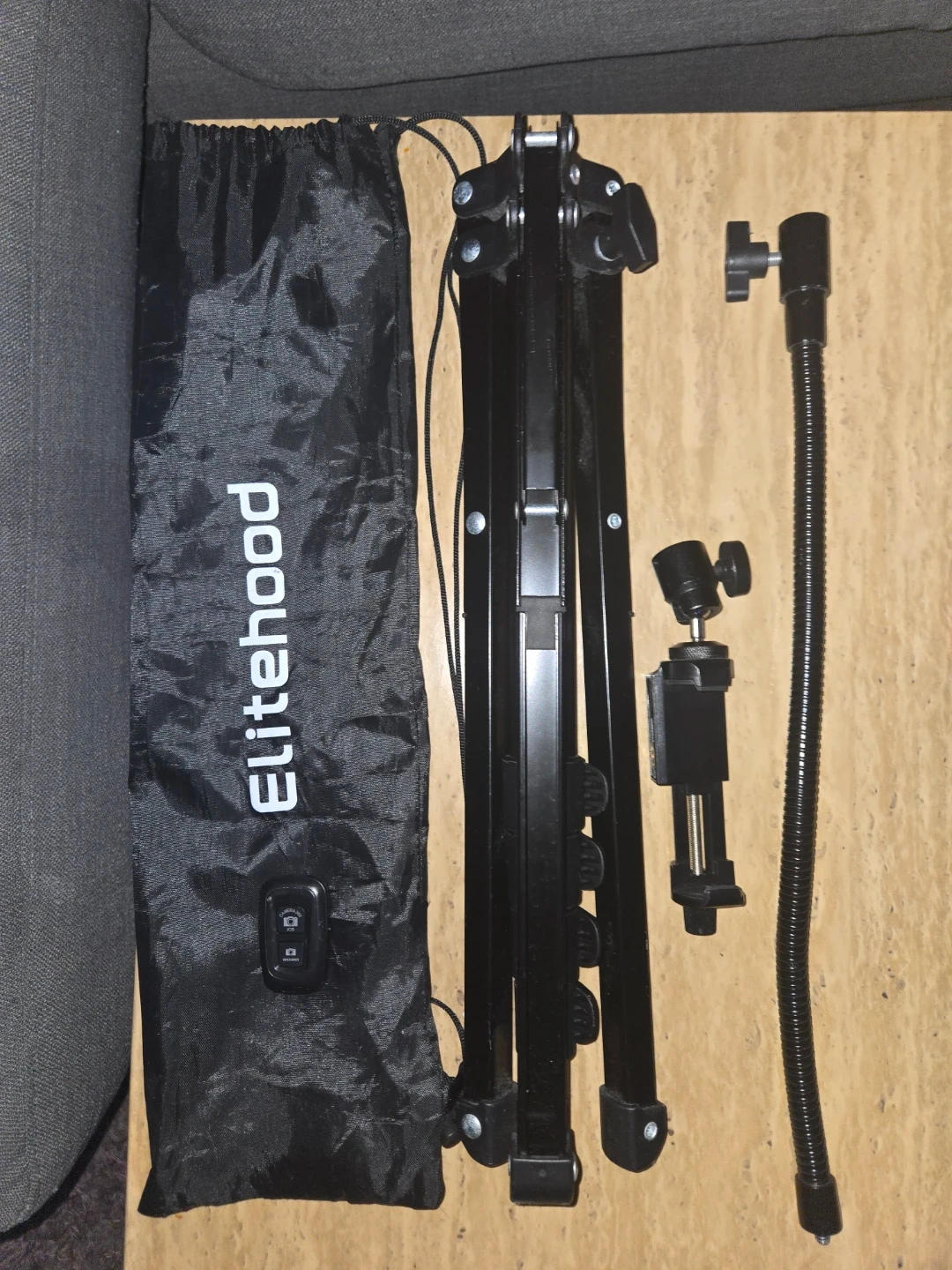 Selling an Elitehood tripod stand, perfect for taking photos and videos! It comes with a phone holder and a carrying bag for easy portability. Great for setting up stable shots anywhere in your home or on the go