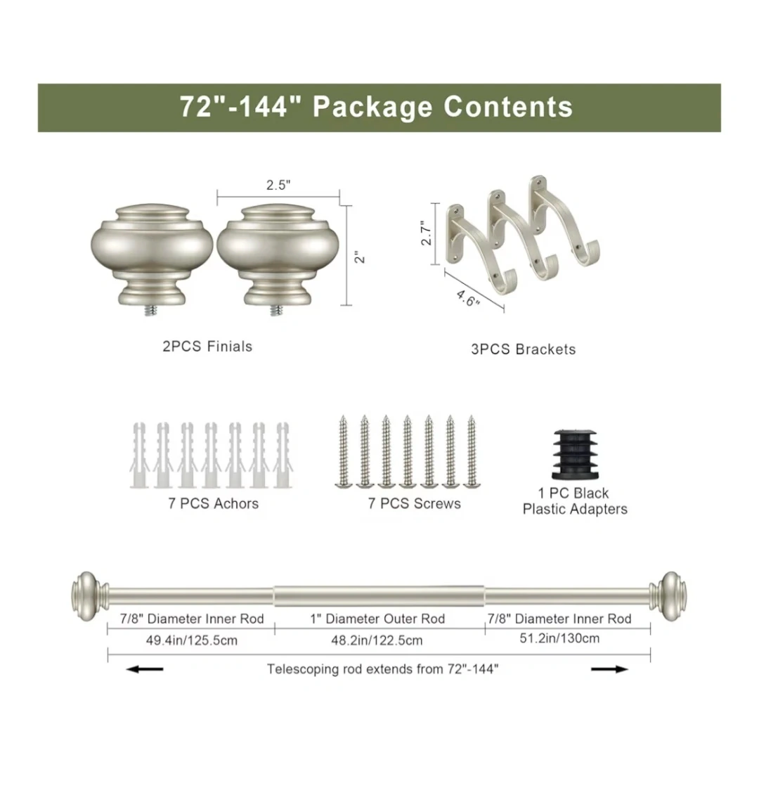 It has a telescopic structure and is easy to install. It includes 2 finials, 3 brackets, 7 anchors, 7 screws and 1 black plastic adapter.