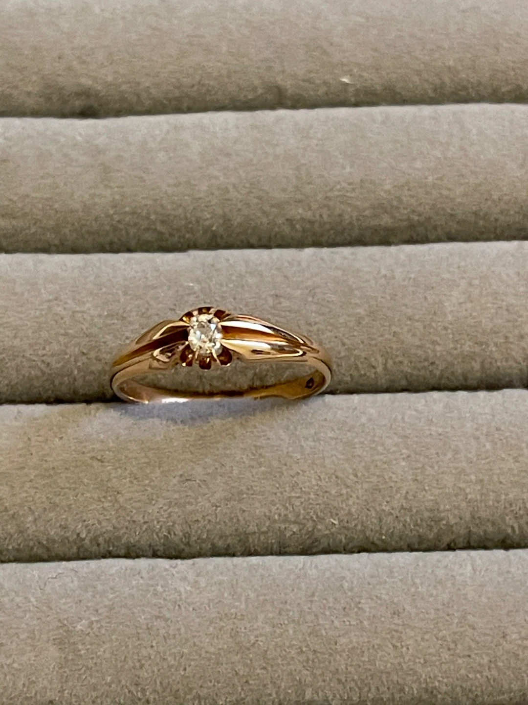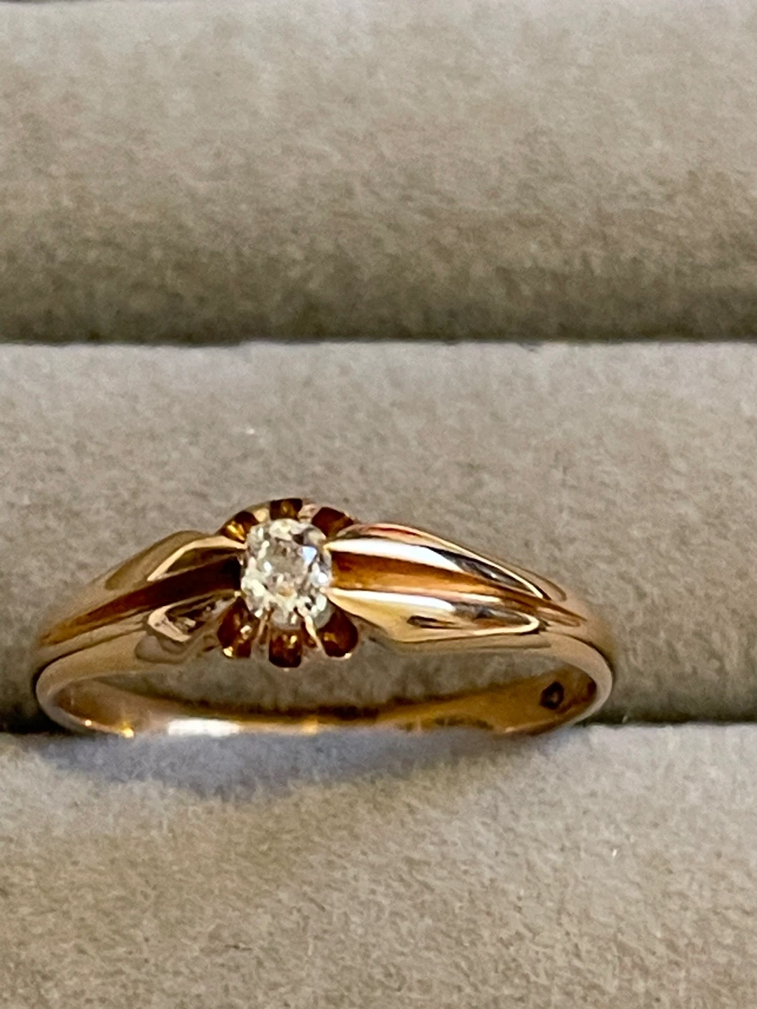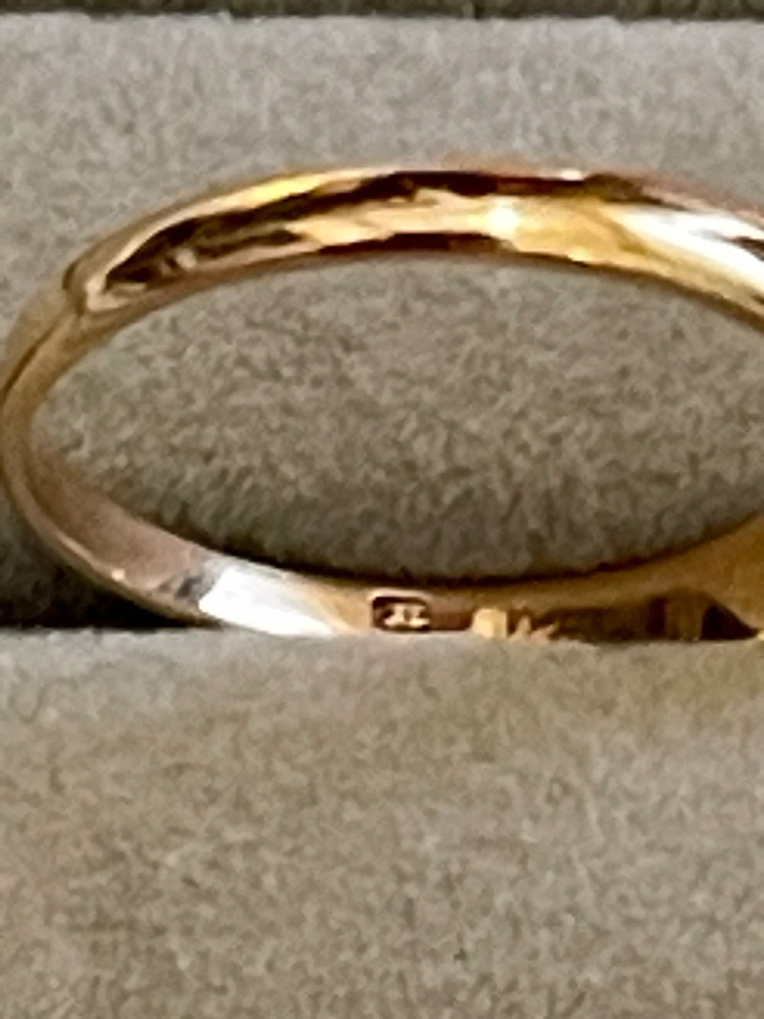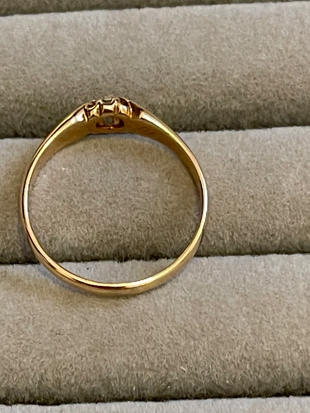 Vintage solitaire ring - it was my mother's first ring, with no carat marking, however she confirmed it is 14k yellow gold and features approximately .17-.20 crt diamond, with JI and Diamond marking inside the ring, and is approximately a size 9. She is uncertain and lacks information about its origins, though it was passed down from her mother, my grandmother. The ring is in excellent condition, having been meticulously maintained and preserved. π.