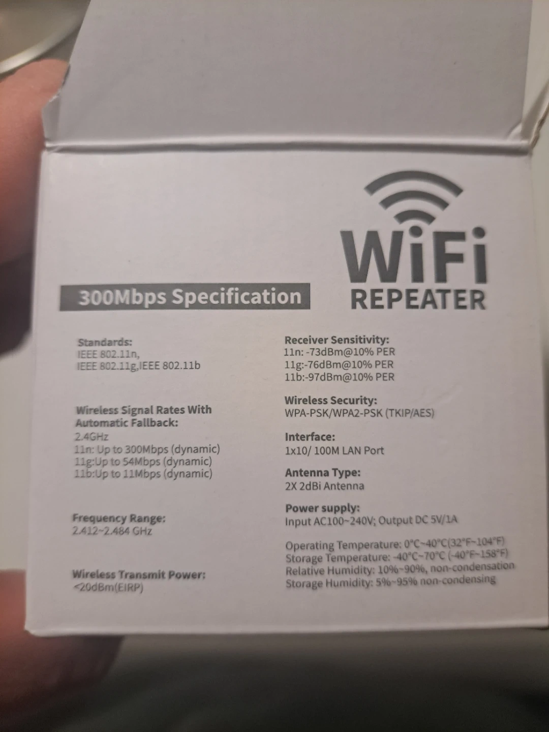 Selling a WiFi repeater with a 300Mbps specification. It supports IEEE 802.11n, IEEE 802.11g, and IEEE 802.11b standards.