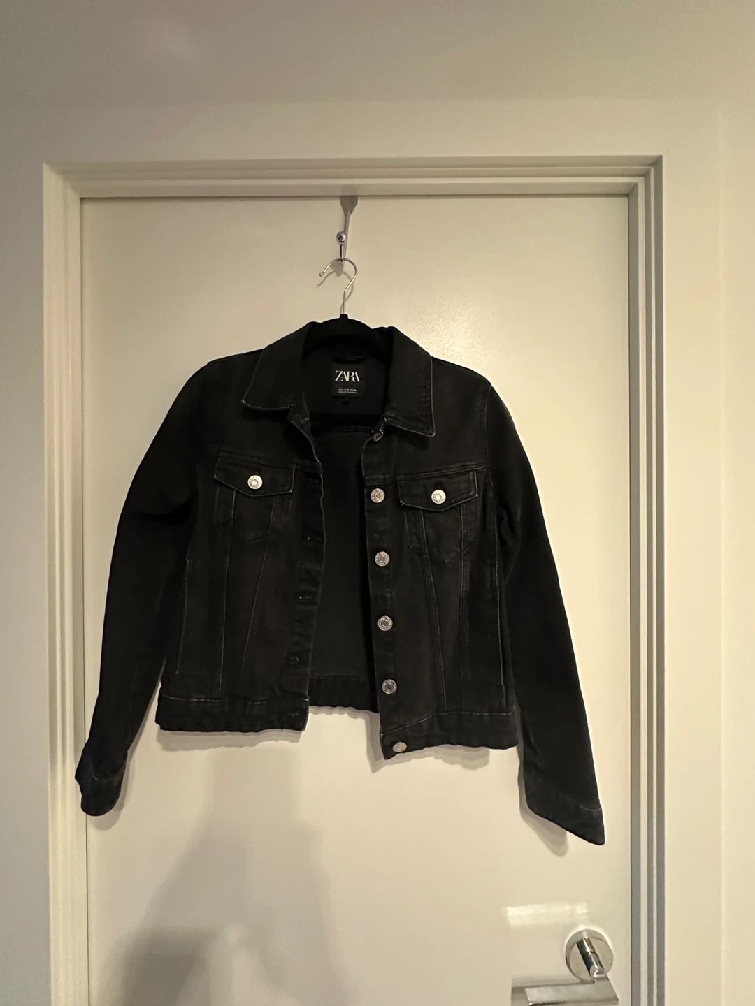 Selling a Zara black denim jacket in size S. It's in great condition and ready for a new home! Perfect for layering or wearing on its own. The material is durable and comfortable, making it a versatile addition to your wardrobe