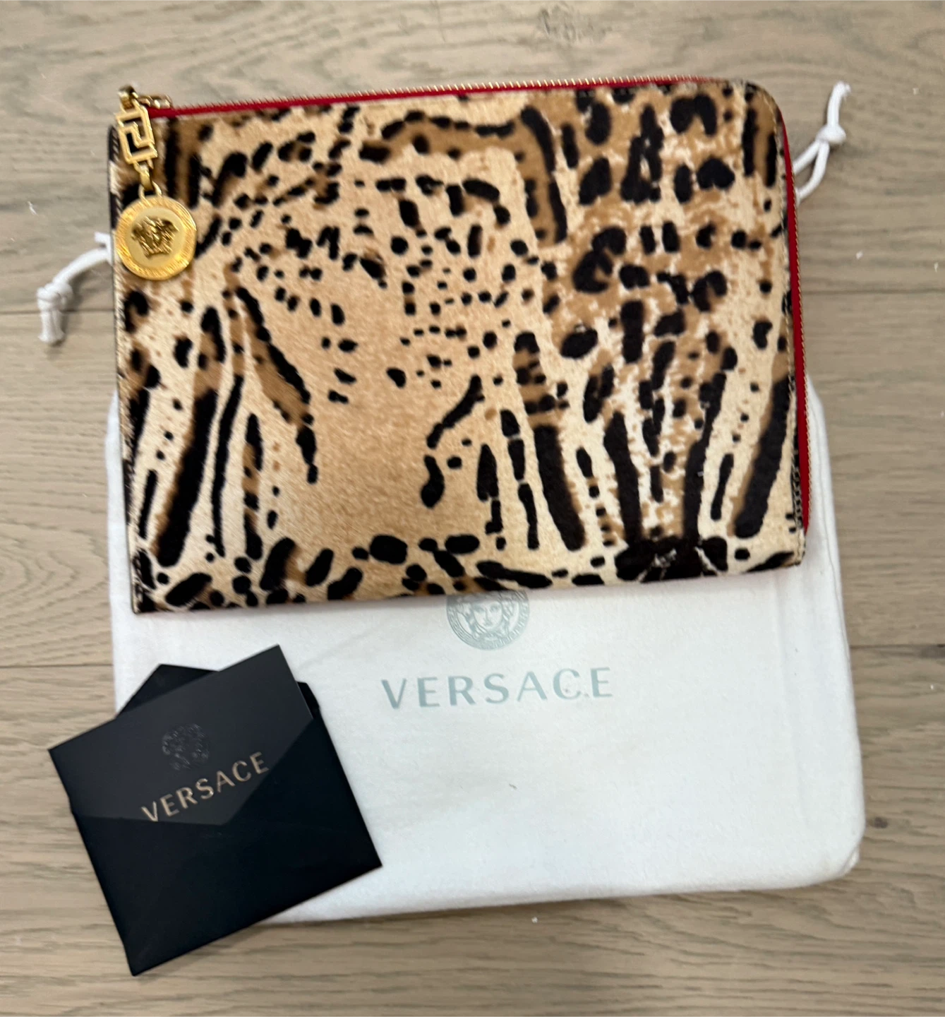 Selling a stylish Versace pouch! It features a vibrant red exterior on one side and a unique animal print on the other. Comes with its original dust bag and cards