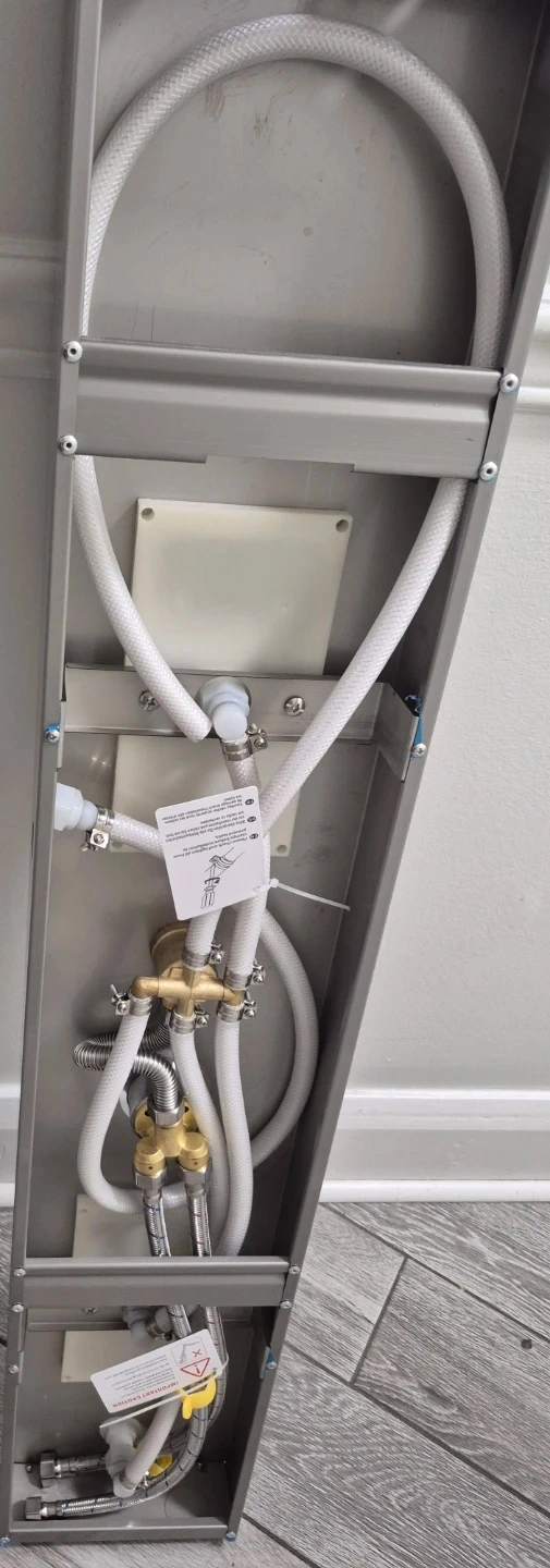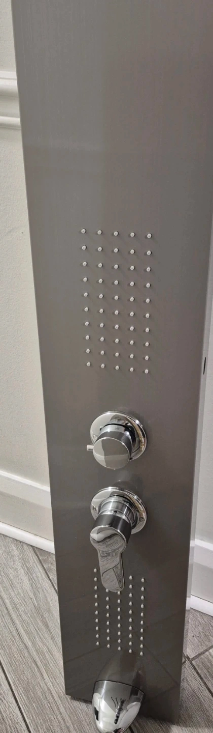 Selling a brand new ROVOGO shower panel tower, still in its original box! This is the RVG1208-CUPC model, featuring a brushed finish. It has a stainless steel shower panel, rainfall shower head, high-pressure body jets, and a handheld shower and tub spout. It's also CUPC certified
