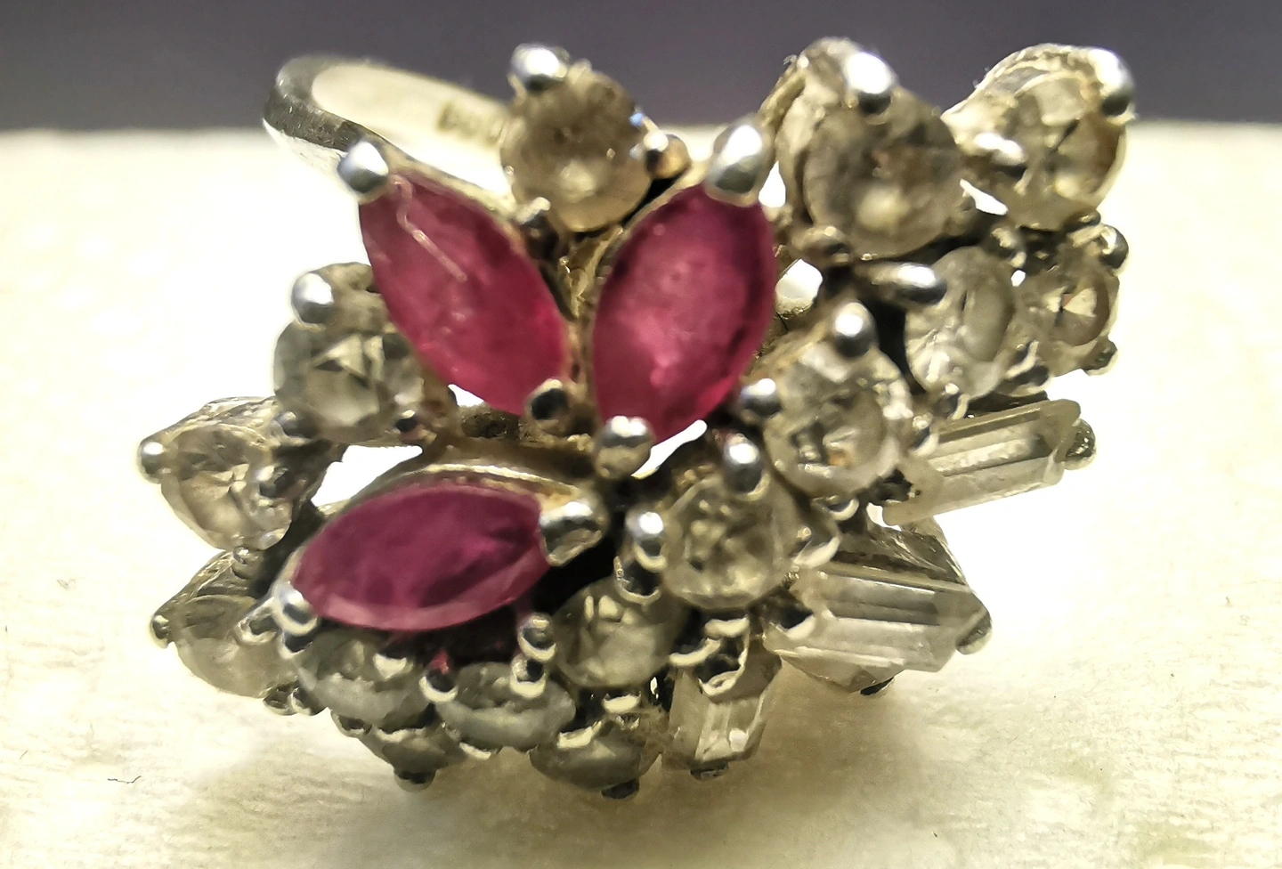 This vintage cocktail ring, crafted from 925 sterling silver, features a starburst design with pink gemstones and crystal accents.