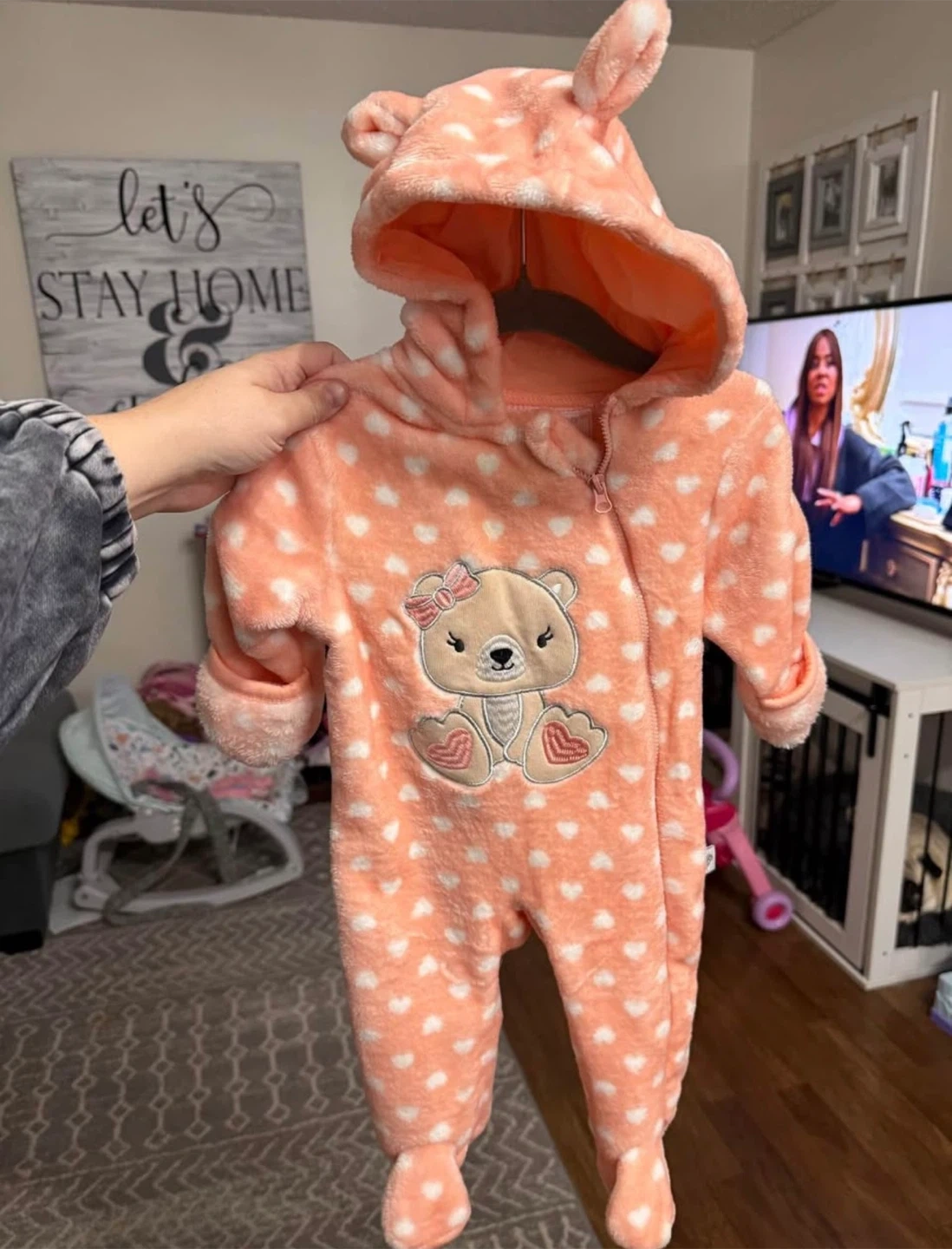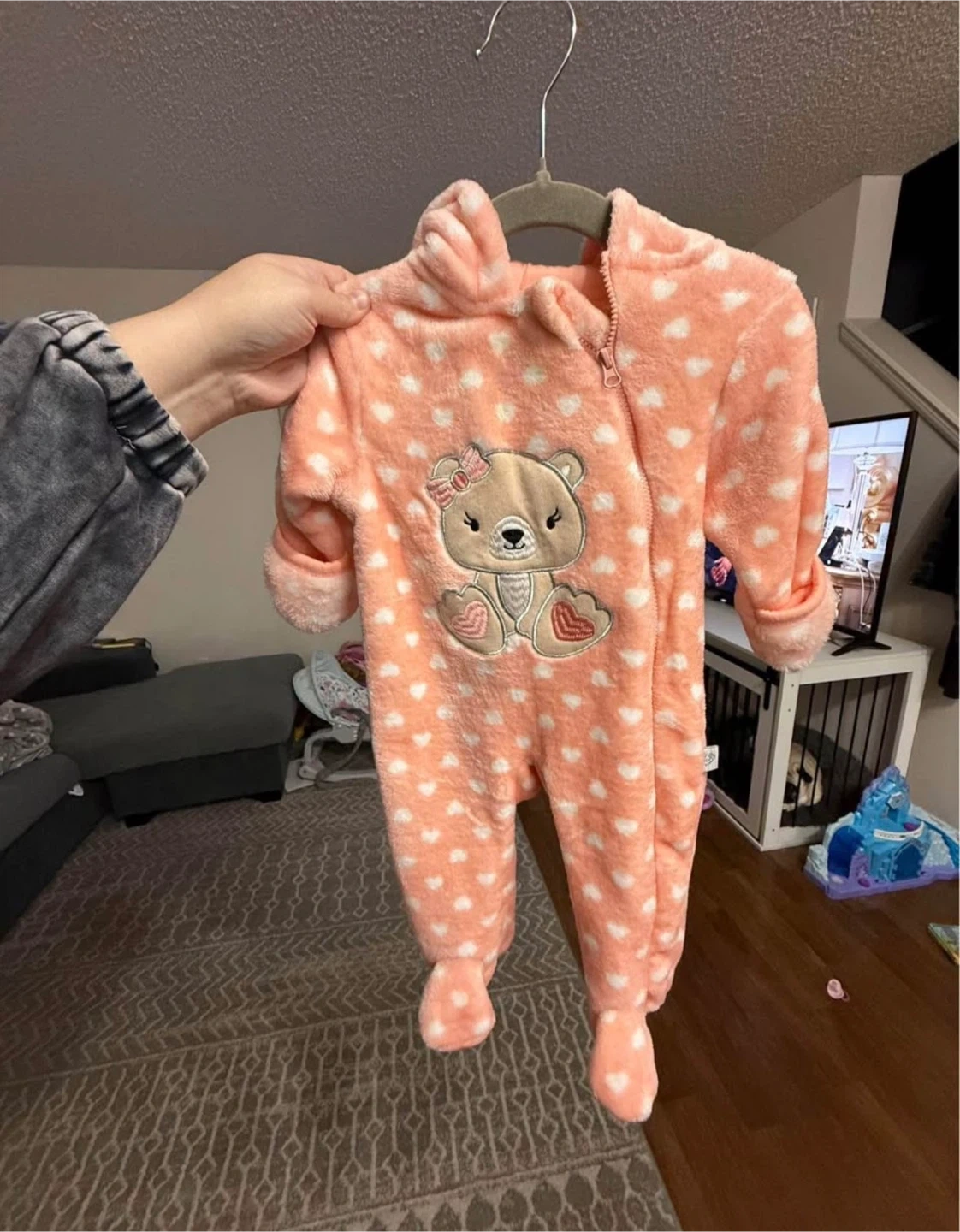 Super cute and cozy Joyspun baby onesie in size 0-3 months! It's made of 100% polyester and features an adorable teddy bear design. Perfect for keeping your little one warm and snuggly.
