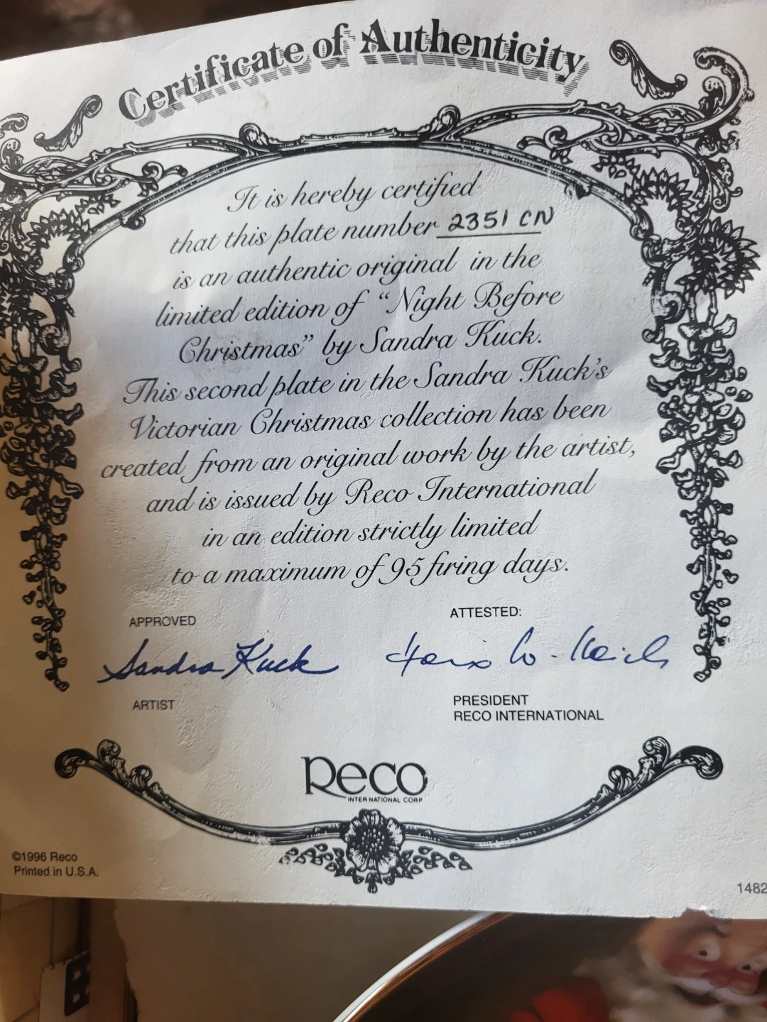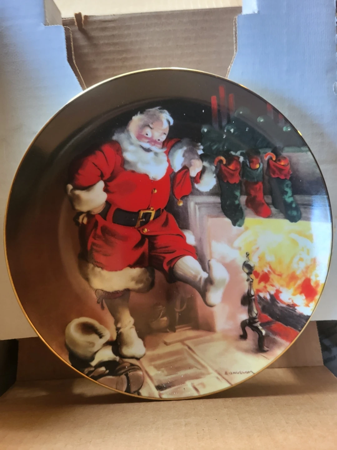 Selling a Knowles plate from the "Santa By the Fire" series. It's the first issue in The Sundblom Santa Series of Christmas plates inspired by the memorable art of Haddon Sundblom. The plate is a 1989 limited edition. Also included is a certificate of authenticity for a "Night Before Christmas" plate by Sandra Ruck.