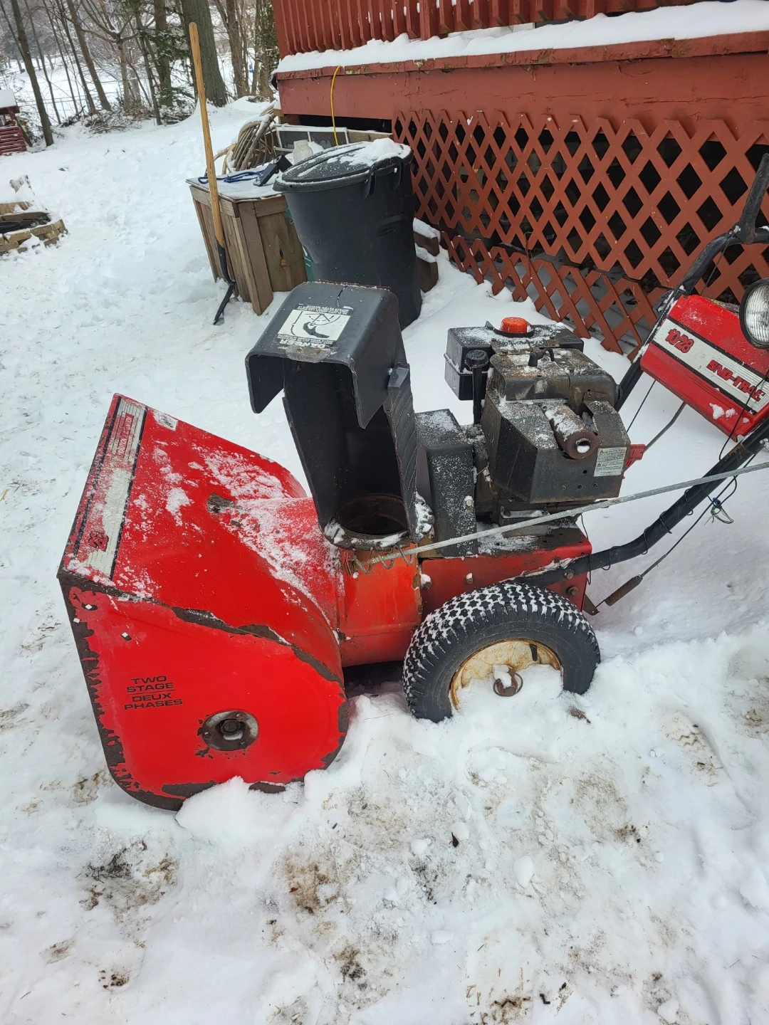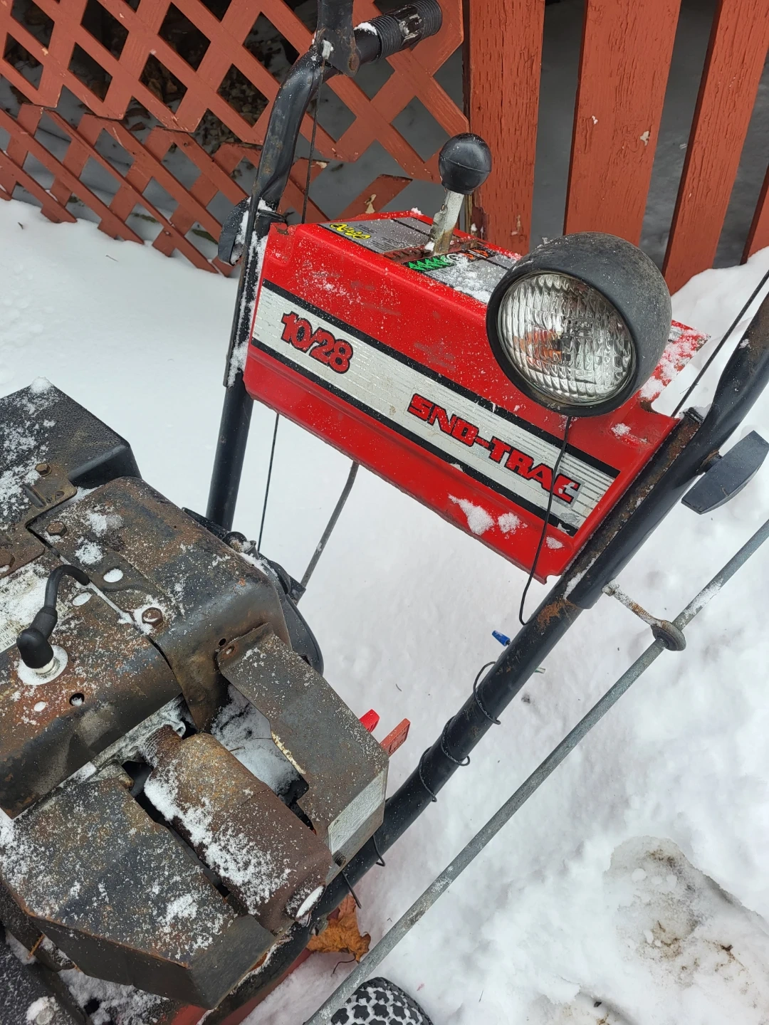 Selling a Sno-Trac 10/28 snowblower. It's red and black and looks like it's ready to tackle some snow!