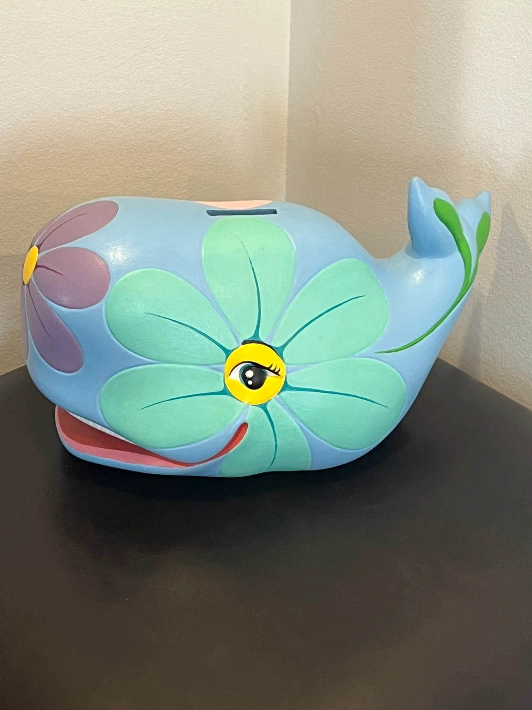 This is a cute ceramic hippie flower whale coin bank, made by Atlantic Mold! It's got a really unique flower design, and it's in great shape. Perfect for adding a bit of fun to your savings!