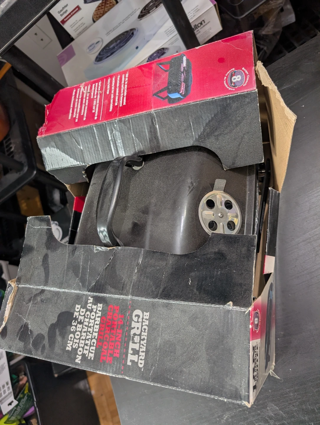 Selling a brand new Backyard Grill 14-inch portable charcoal grill! It's fully assembled and ready for your next barbecue. It features a porcelain-coated steel cooking grate and easy-fold legs with a locking lid for safe portability. The box says it has an 8-burger capacity!