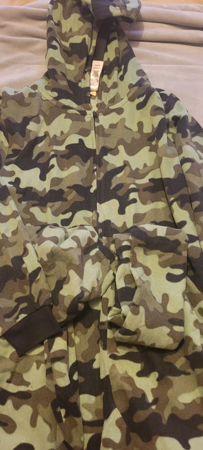Cozy up in this camouflage onesie from The Children's Place! It's a size XXL, made of 100% polyester, and perfect for lounging around the house or for a fun pajama party